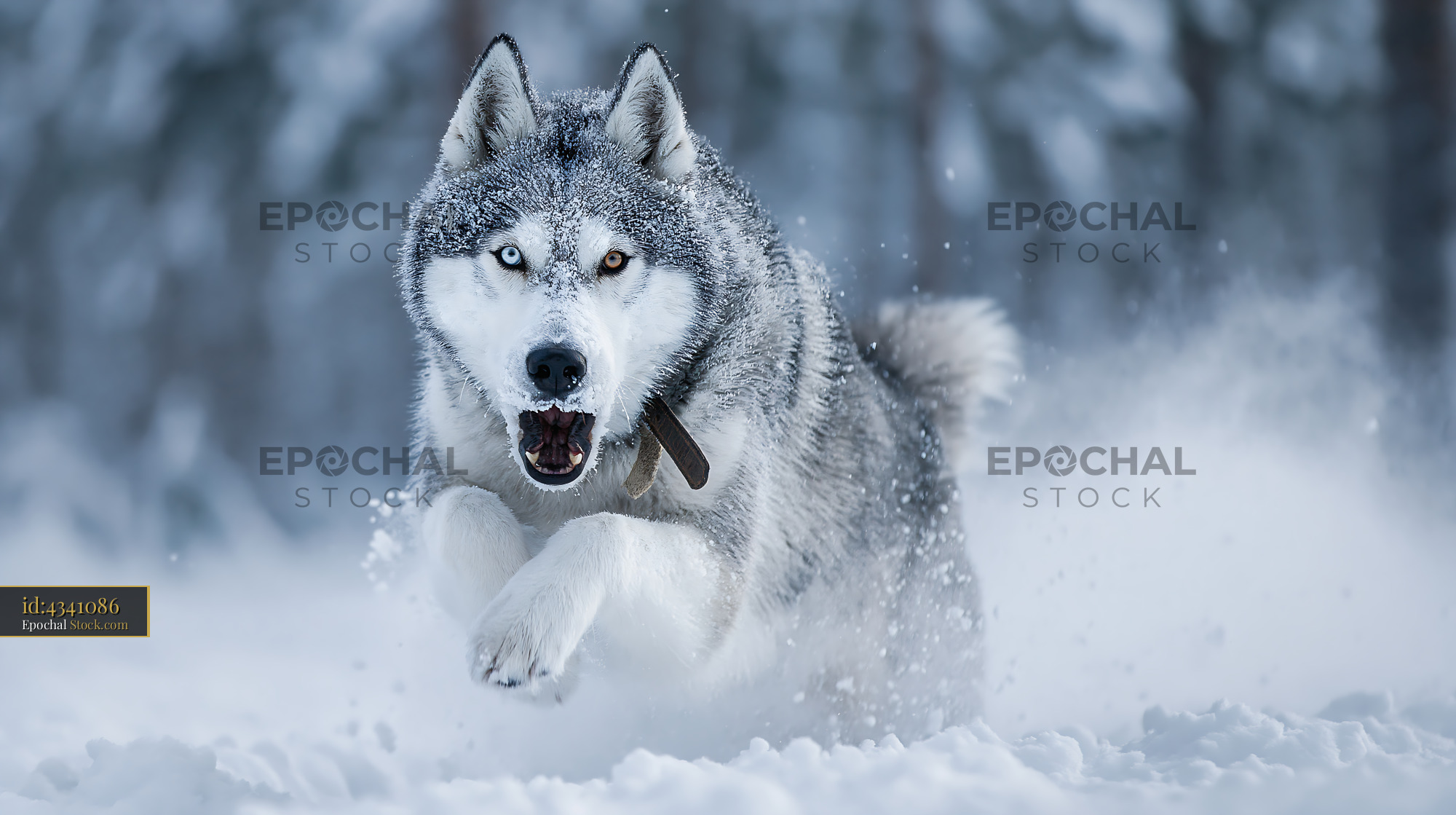 A energetic Siberian husky with heterochromia runs directly towards the camera through a snowy winter landscape, capturing the raw power, freedom, and wild spirit of the breed in its natural element.