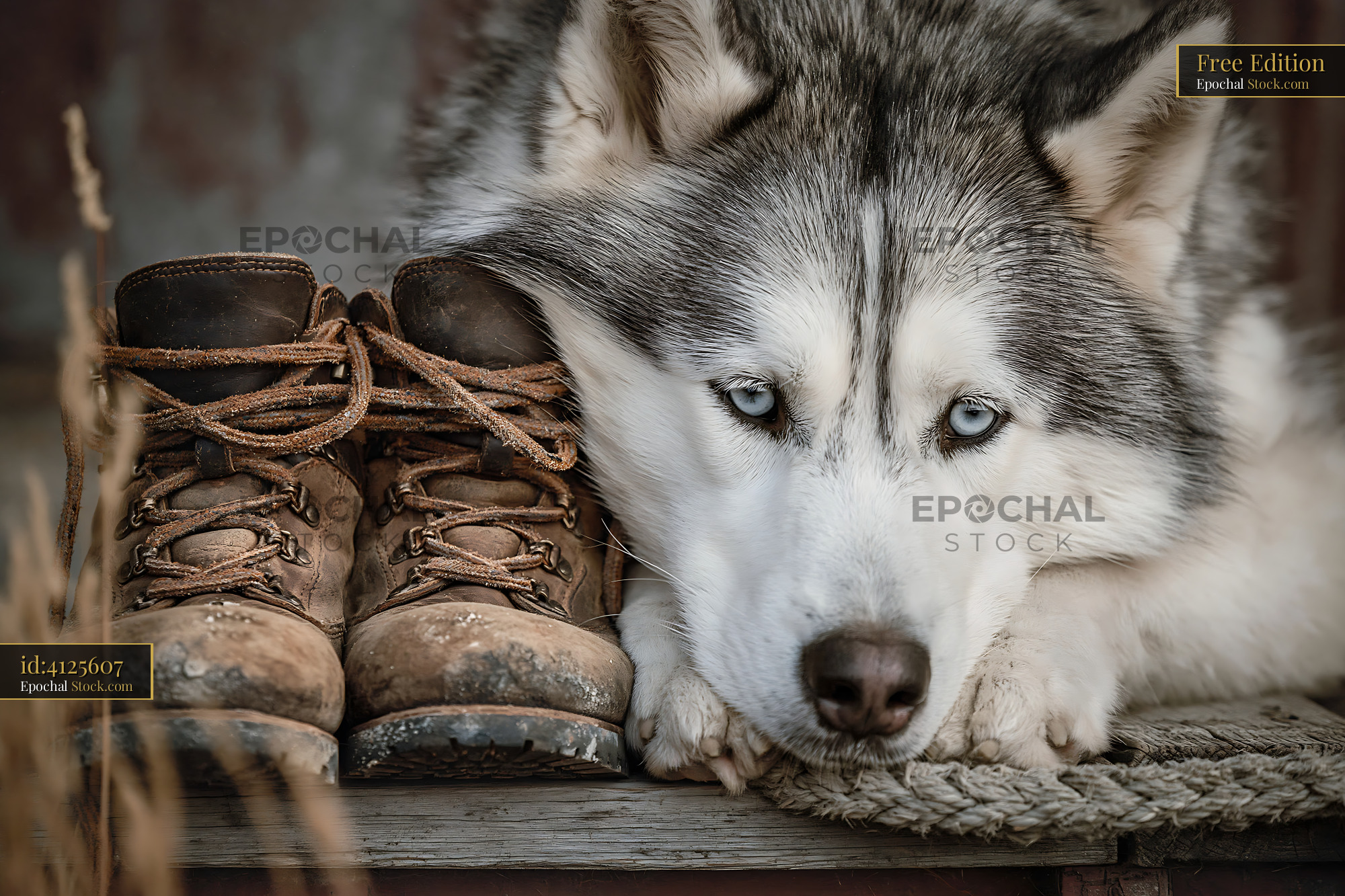 A loyal Siberian Husky rests its head beside weathered leather hiking boots on a rustic wooden porch, evoking themes of waiting, devotion, and shared outdoor adventures.