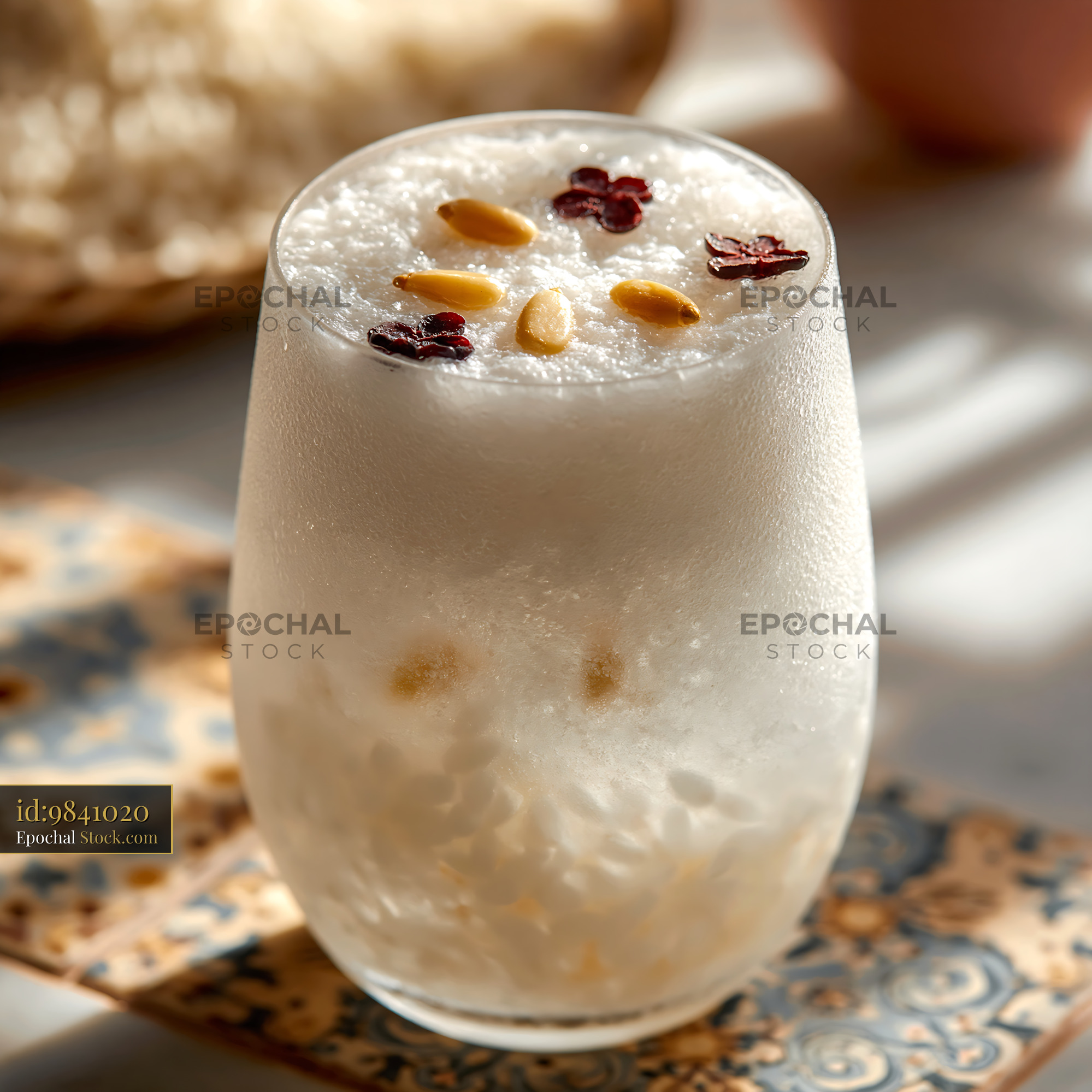 A creamy sikhye rice smoothie served in a glass, garnished with traditional pine nuts and jujube, capturing a modern twist on Korean heritage under soft sunlight.