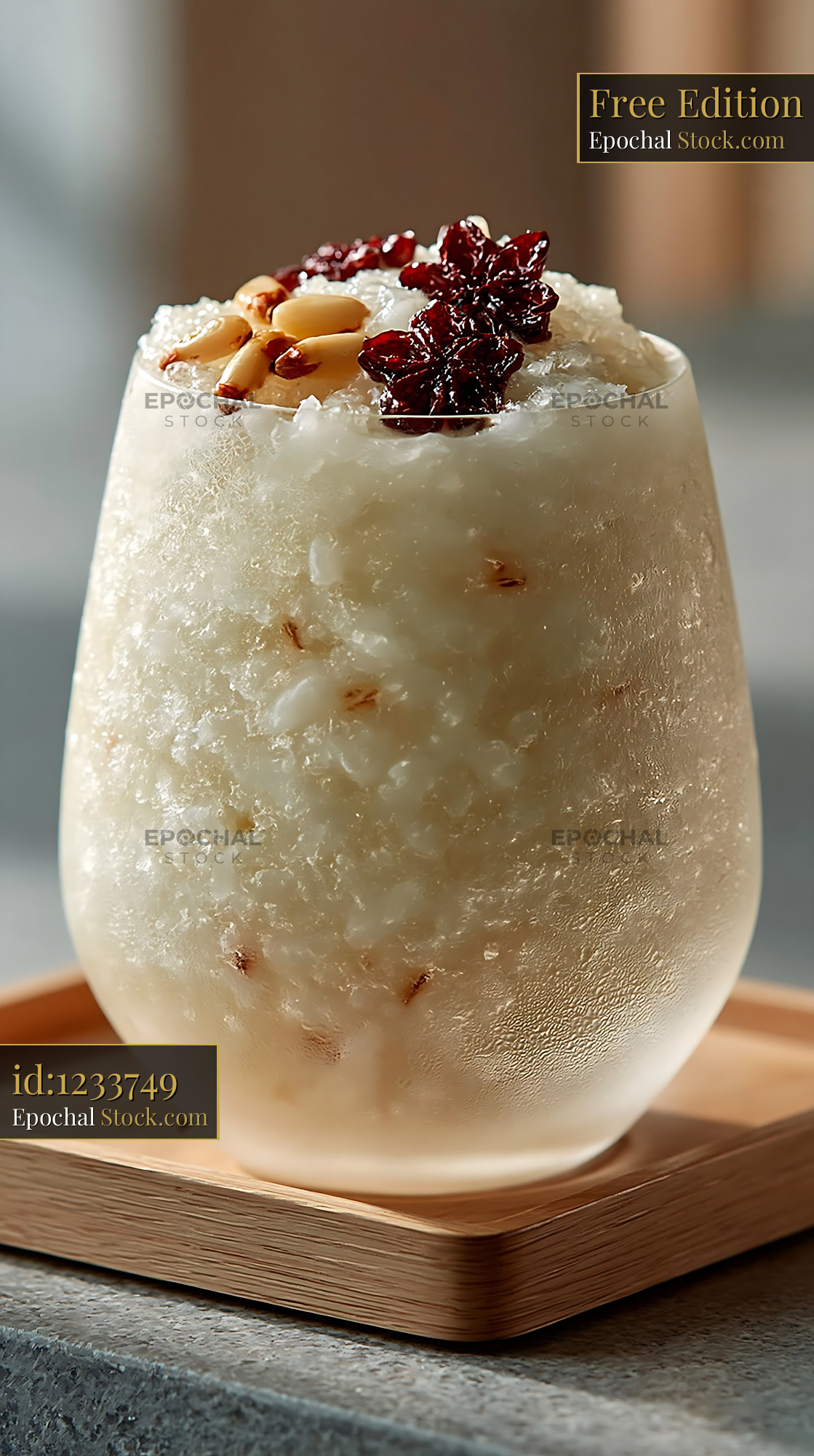 A refreshing Korean sikhye rice smoothie served in a chilled glass, topped with pine nuts and jujube, capturing a blend of traditional flavors and modern presentation.
