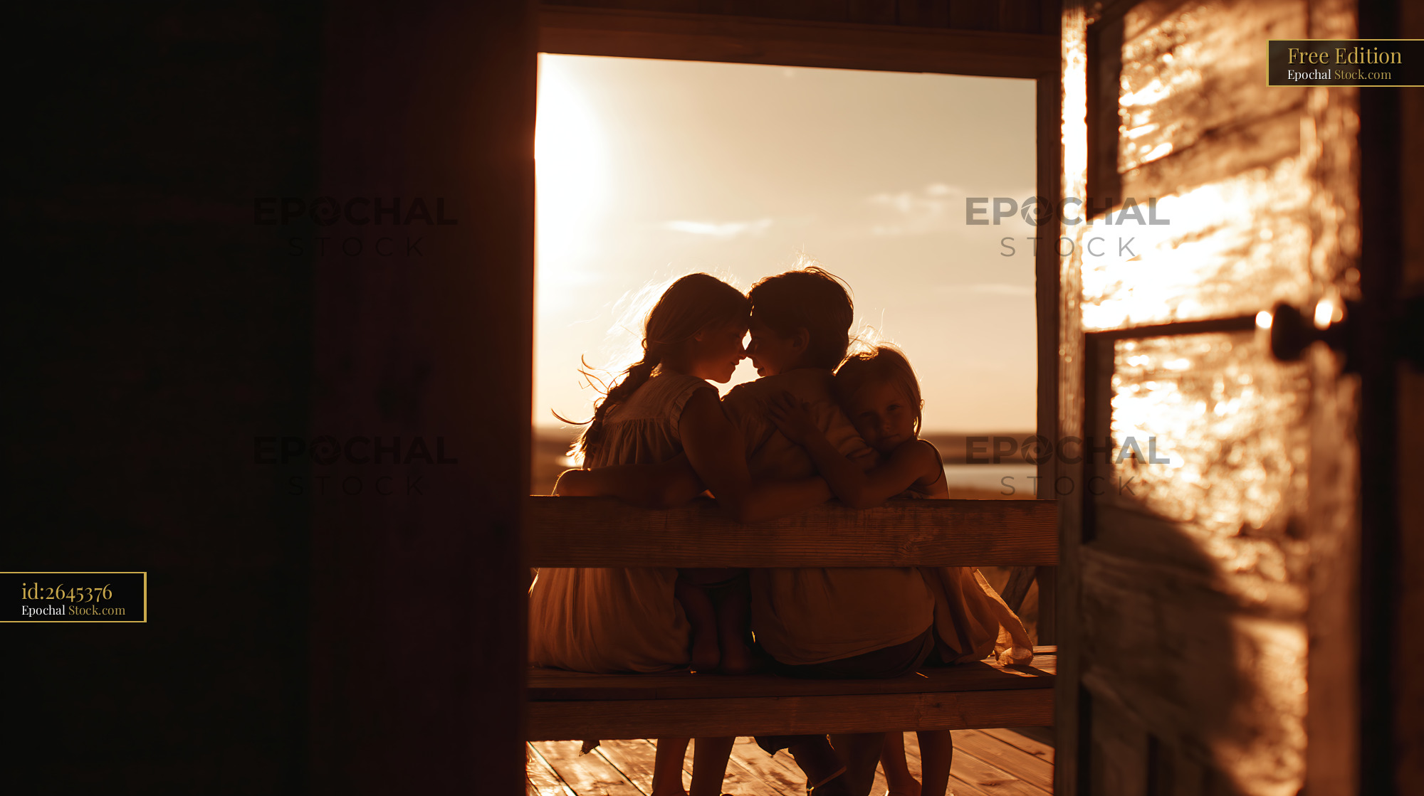 A heartwarming silhouette of three siblings embracing on a rustic porch during golden hour, capturing themes of childhood innocence, family bonds, and summer nostalgia.