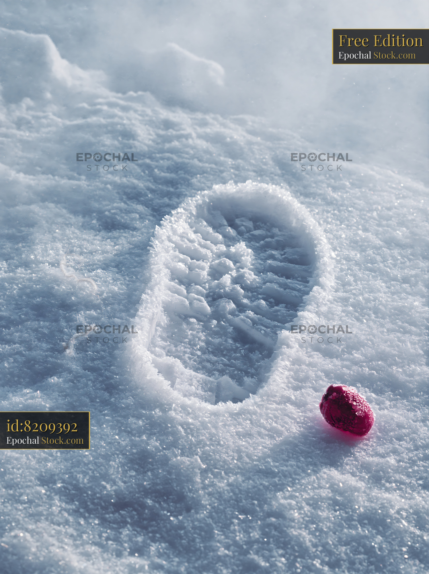 A crisp footprint in deep snow sits next to a small red candy, evoking themes of loss, a forgotten trail, and the quiet solitude of a winter landscape.