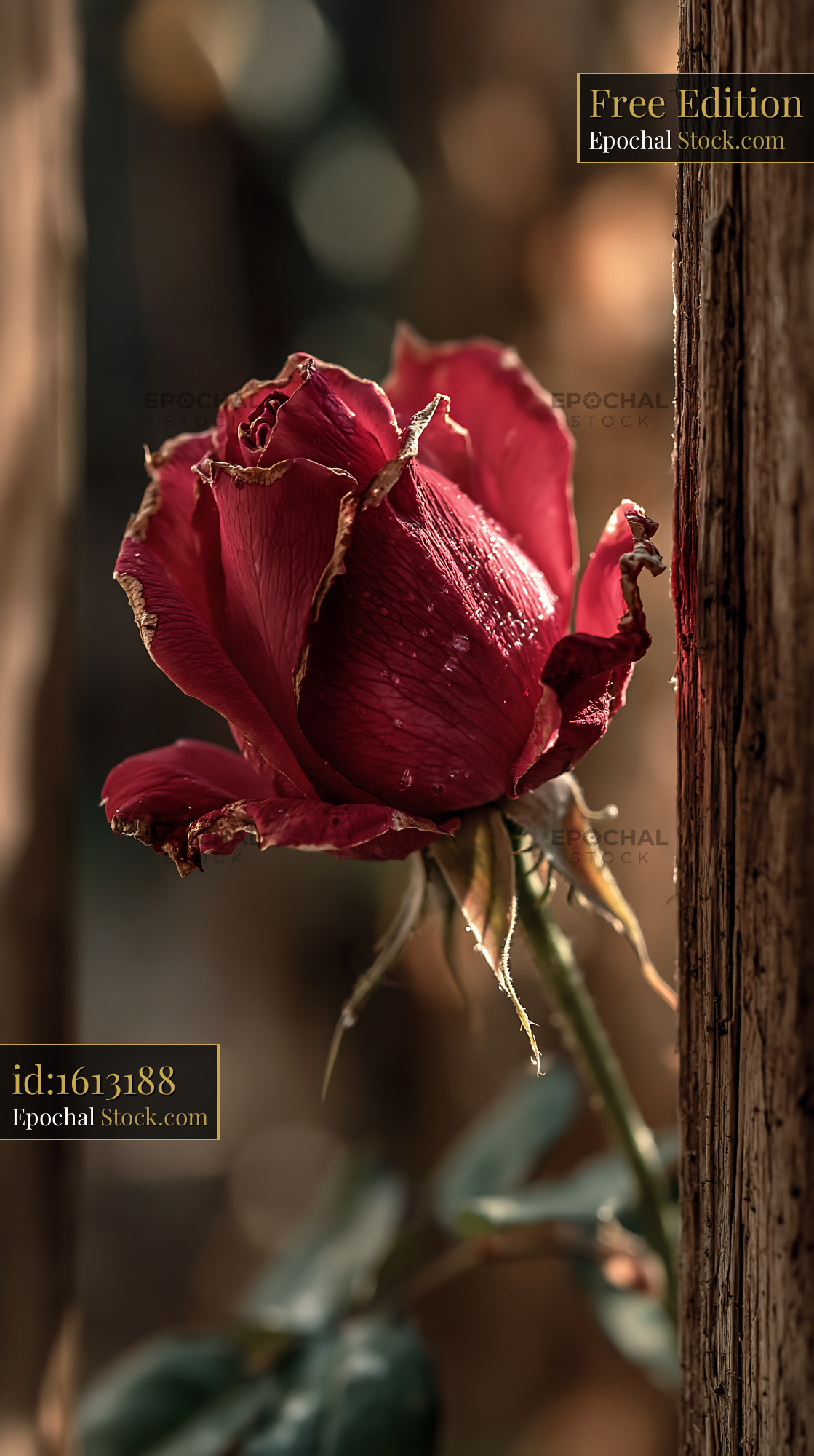 Single red rose wilting against a wooden post during golden hour