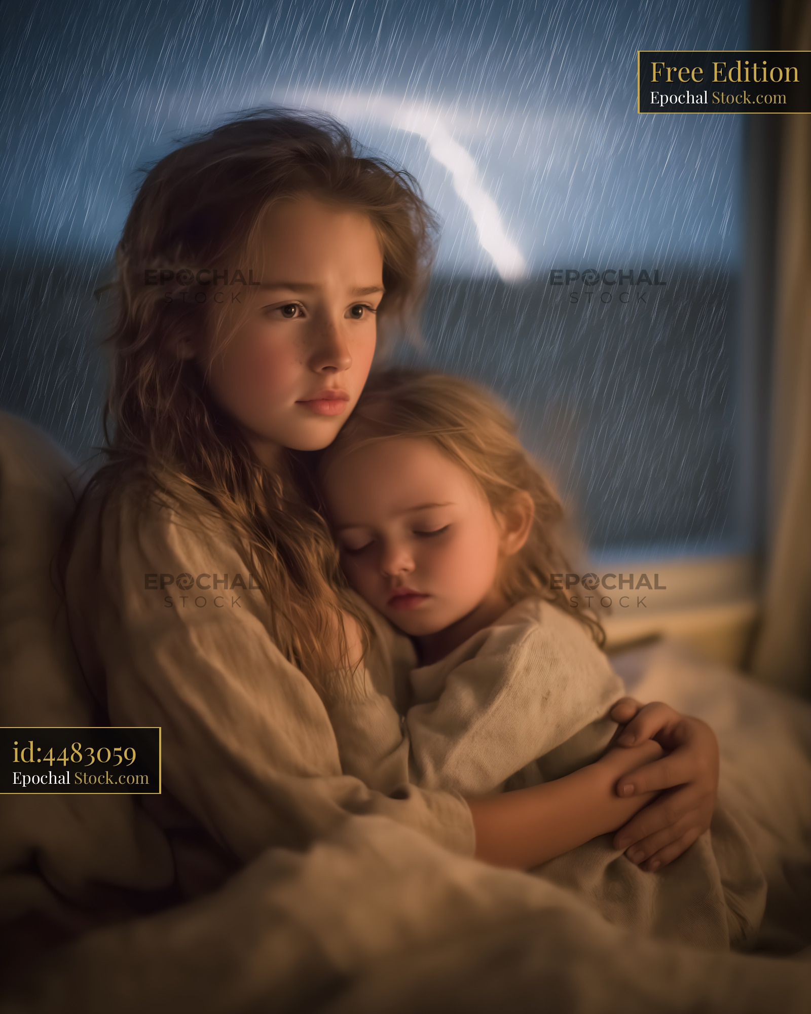 Two sisters sit together in bed as rain falls outside. Lightning lights up the sky. The older sister holds the younger one close for comfort.