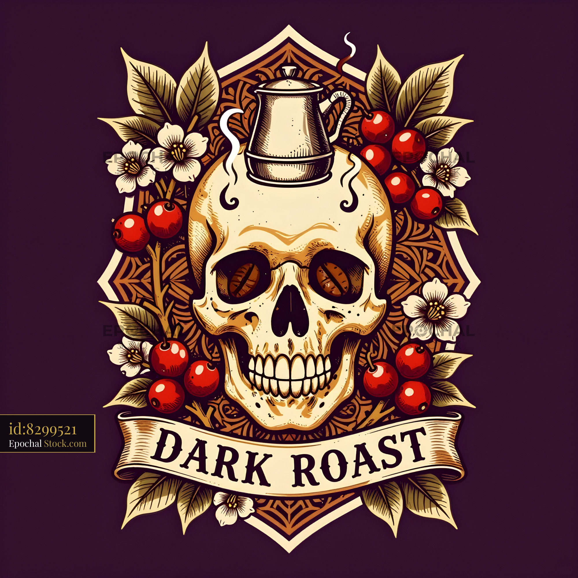 The design shows a skull at the center with a pot on top. Surrounding the skull are red coffee berries and flowers. The words dark roast are displayed at the bottom.