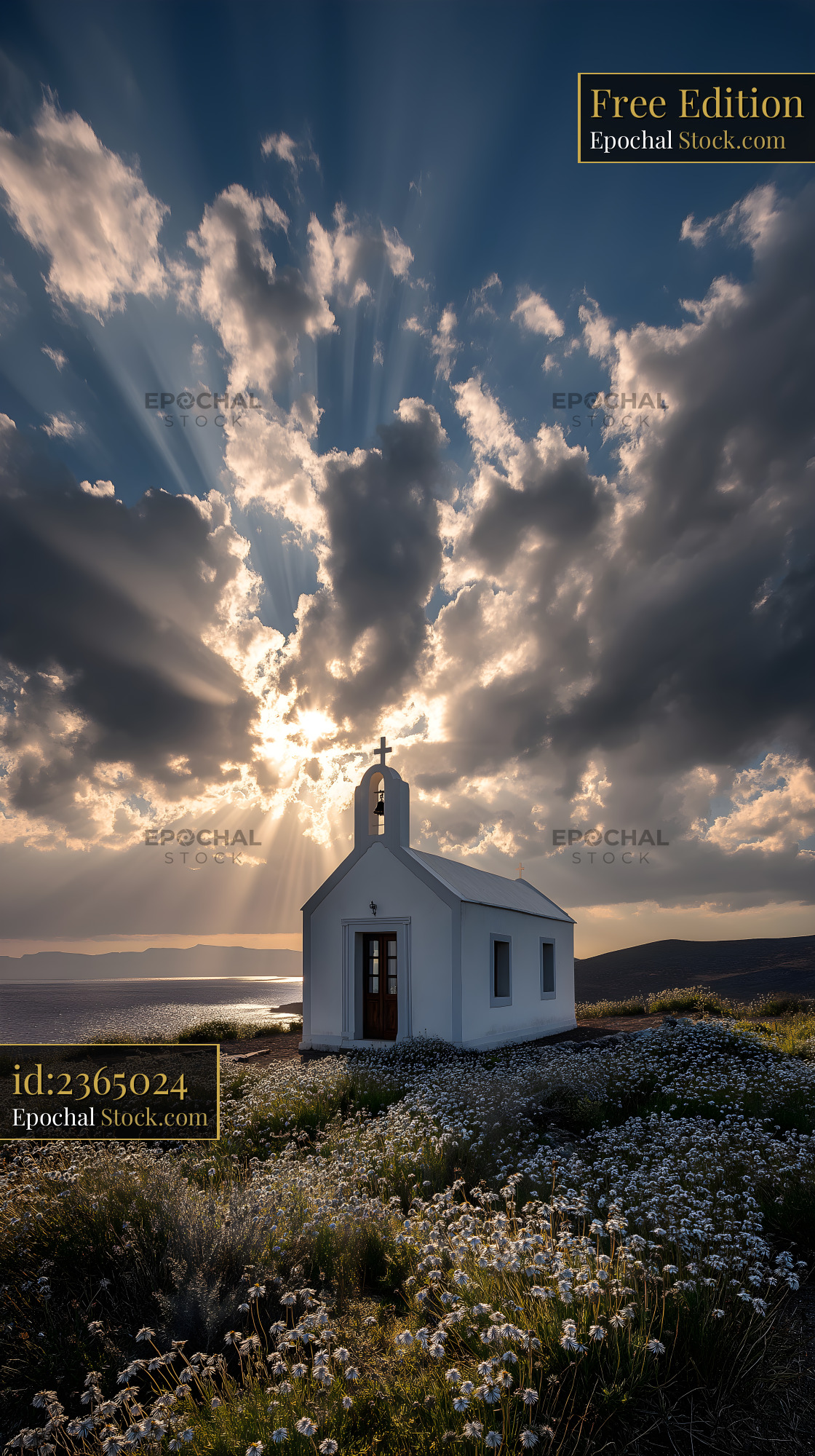 A small church is located on a hill surrounded by flowers. The sun sets behind the clouds, casting rays of light over the landscape. A body of water is visible in the distance.