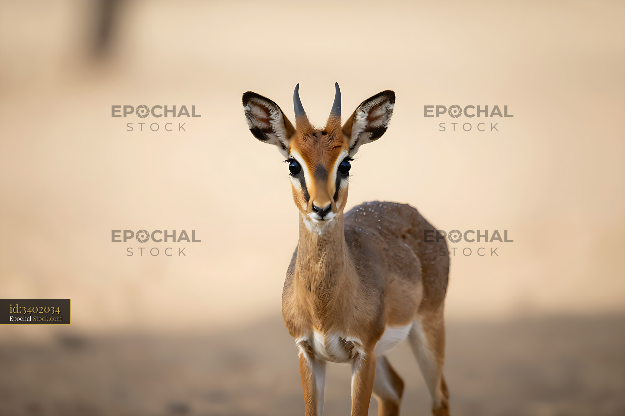 A small dik-dik antelope stands alert in a vast sandy desert, its large eyes and tiny horns evoking themes of vulnerability and survival in the wild.