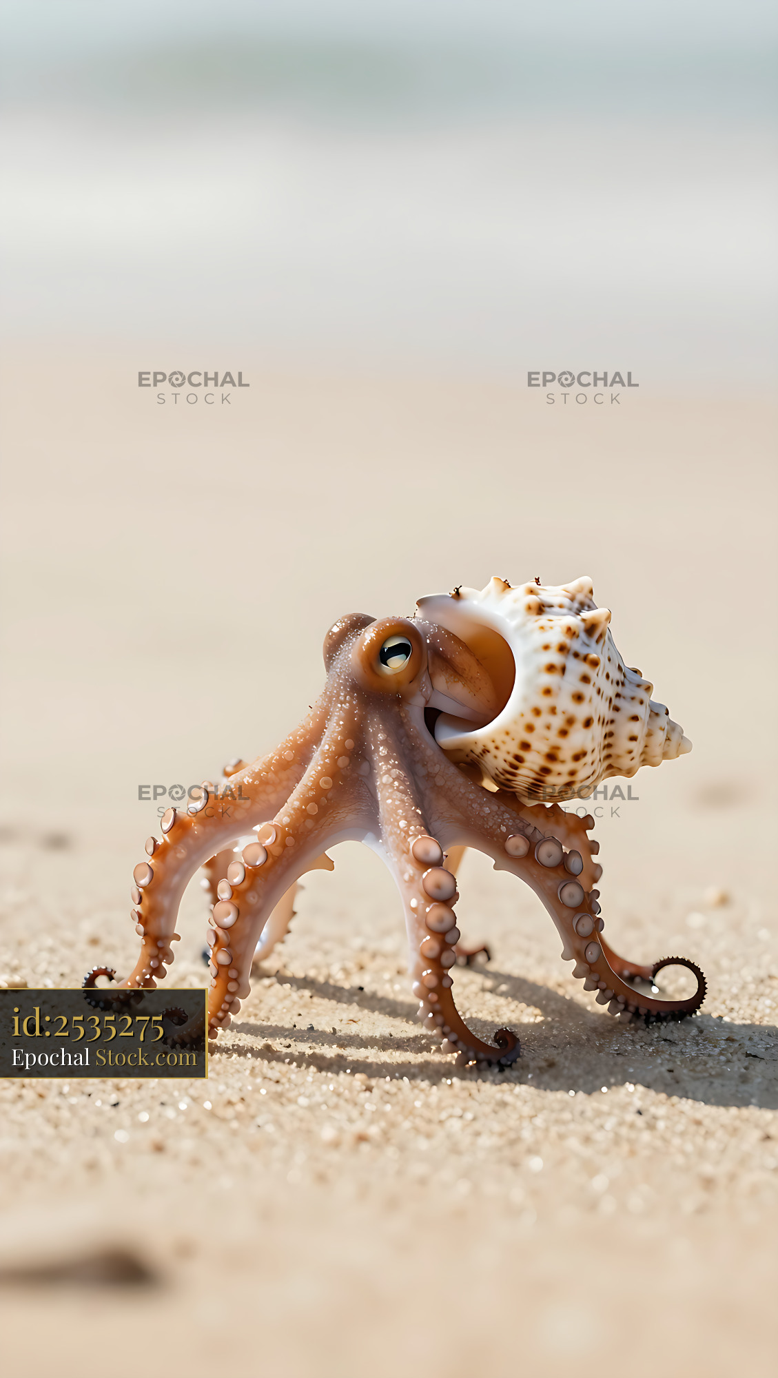 Small octopus carrying a seashell on a sunny sandy beach