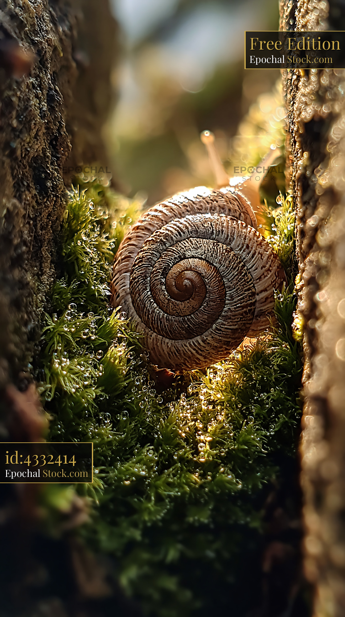 A detailed macro shot of a snail shell resting on dew-covered moss between tree bark, bathed in warm sunlight, symbolizing peace and the beauty of small nature details.