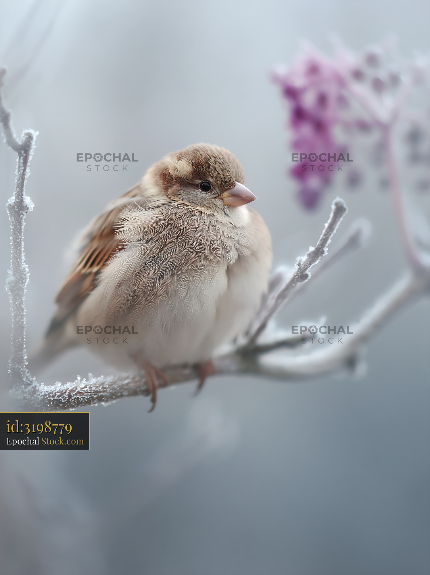 A fluffy sparrow sits puffed up on a bare branch covered in frost, symbolizing resilience and survival in the quiet cold of a winter morning.