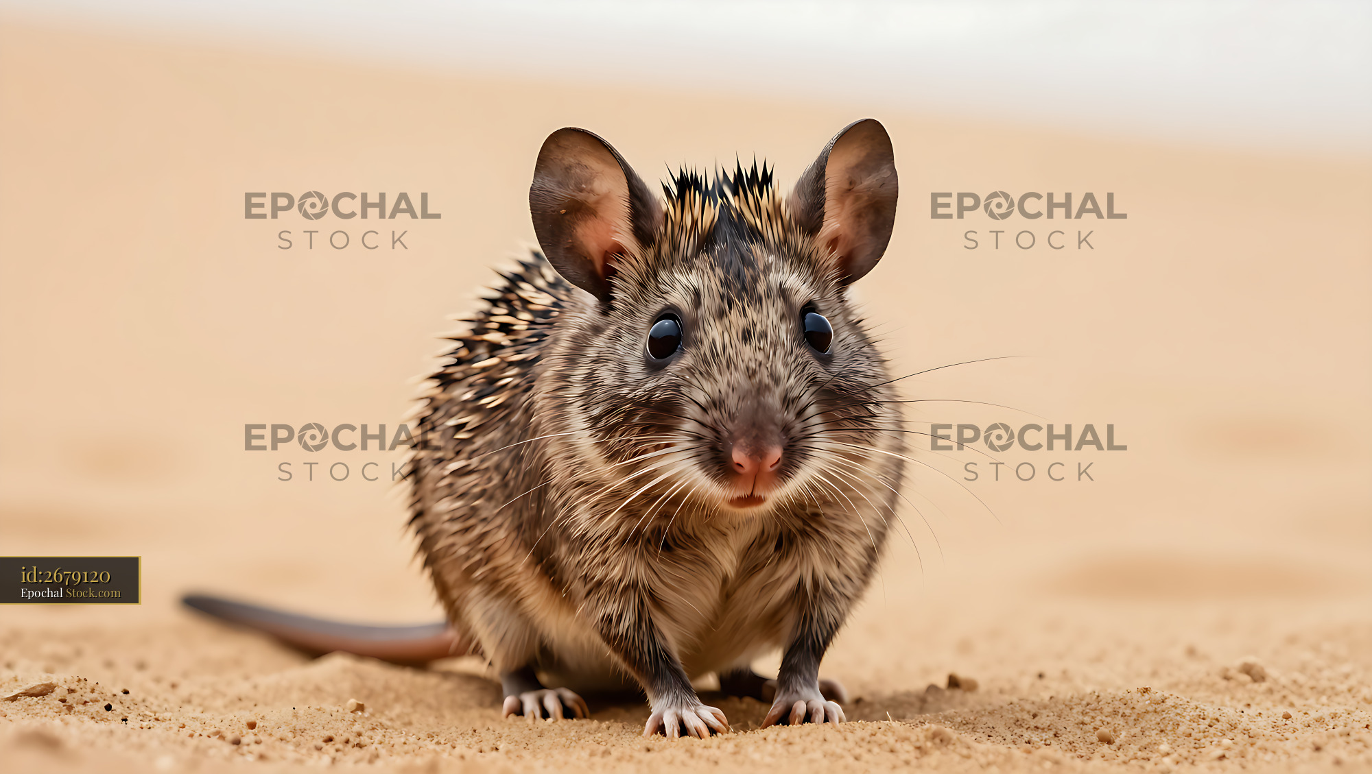 A curious spiny mouse stands alert on golden sand, its large ears and quilled fur highlighted by soft desert light, representing wildlife adaptation and survival in arid environments.