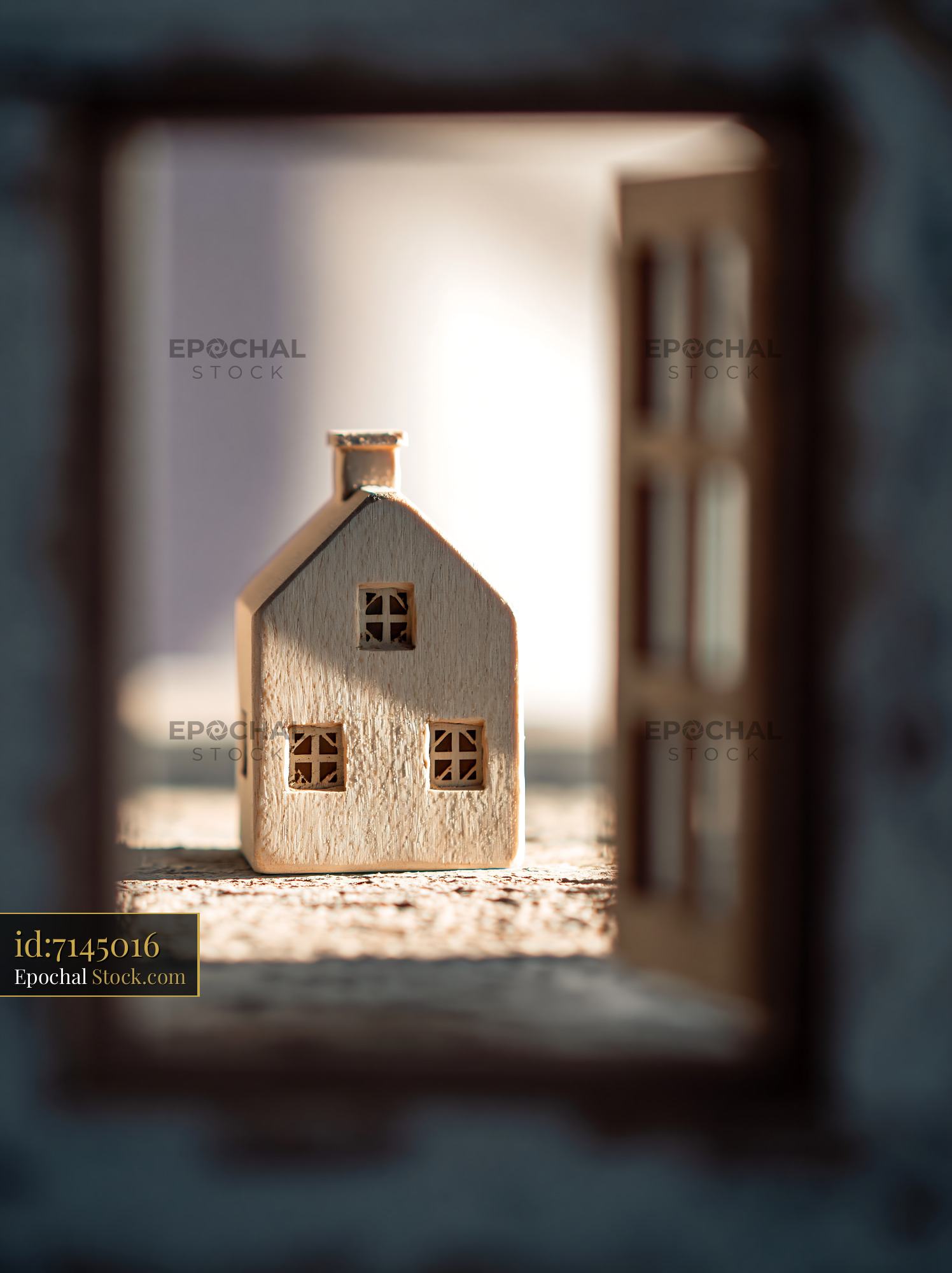 A minimalist wooden toy house stands in warm sunlight, framed by an open doorway, representing concepts of home ownership, real estate dreams, and domestic security.