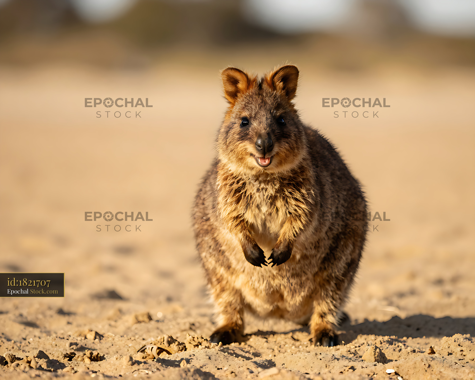 A cheerful quokka looks directly into the camera with a happy expression on a sunny beach, evoking feelings of joy, curiosity, and the unique wildlife of Australia.