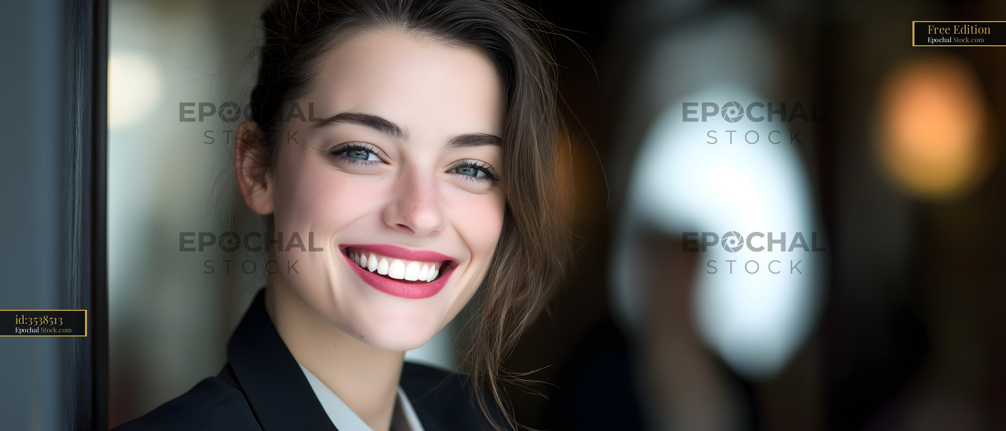 A woman with brown hair smiles brightly while standing indoors. She wears a dark suit and has red lipstick. The setting appears to be a modern office or cafe, with soft light.