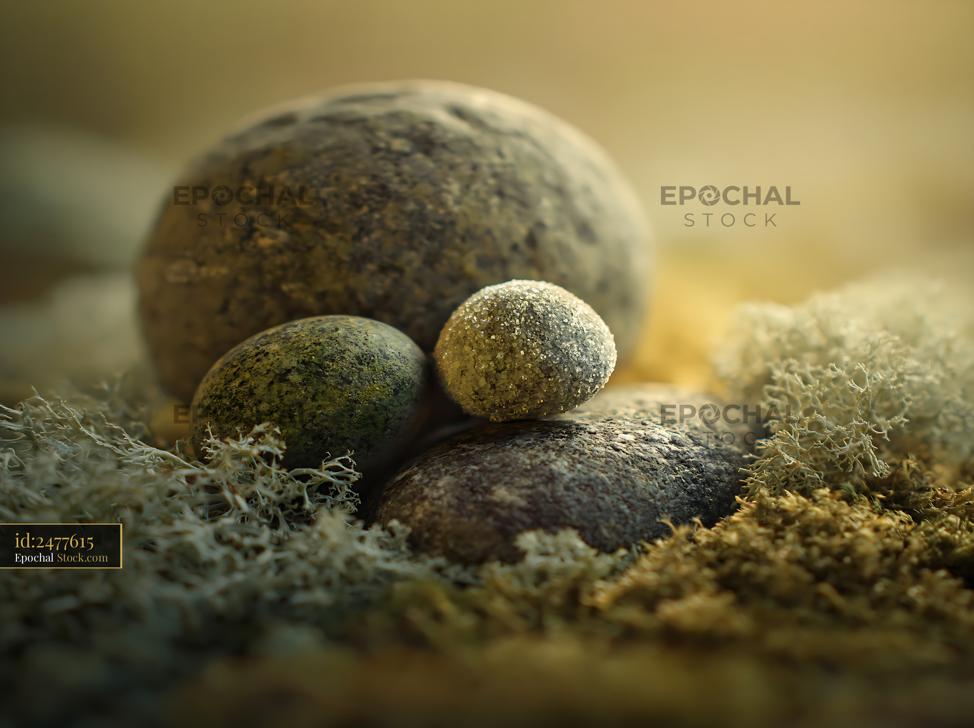A peaceful macro composition of rounded pebbles and delicate lichen bathed in a soft morning glow, evoking a sense of zen, balance, and natural harmony.