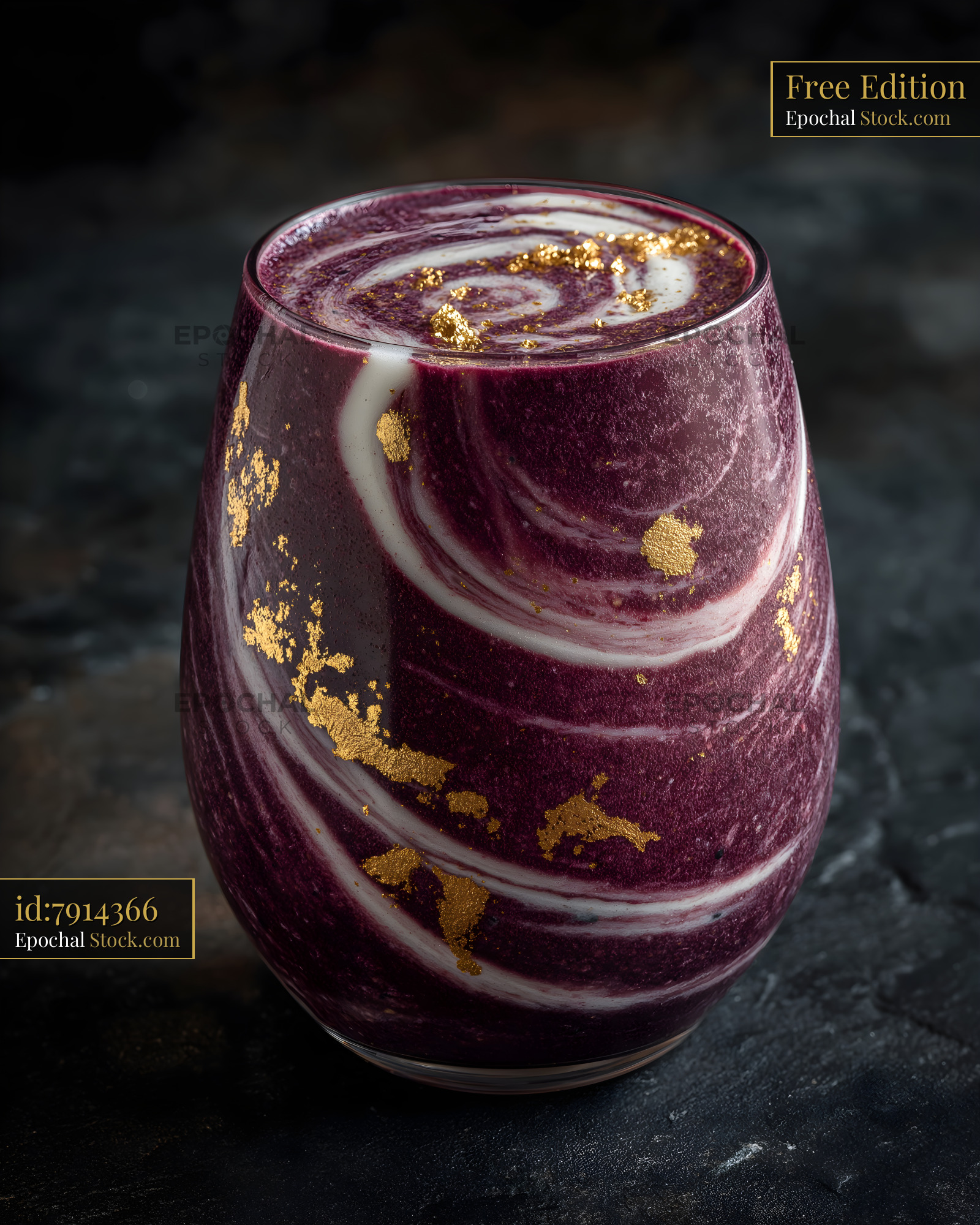 A colorful smoothie with purple swirls and gold flakes sits in a clear glass on a dark surface. The drink showcases rich colors and an appealing design.