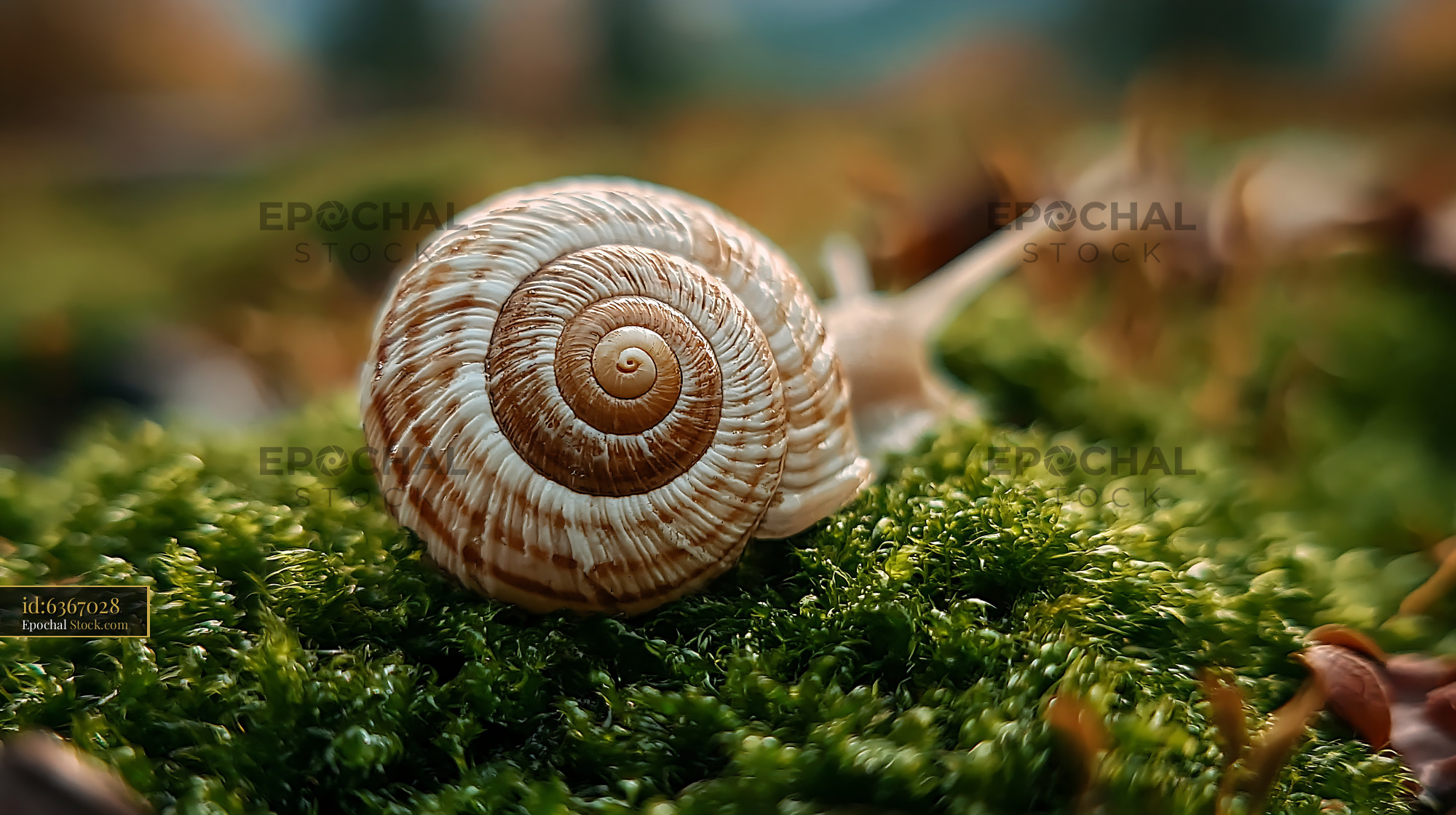 Snail shell with spiral pattern on wet green moss in soft sunlight