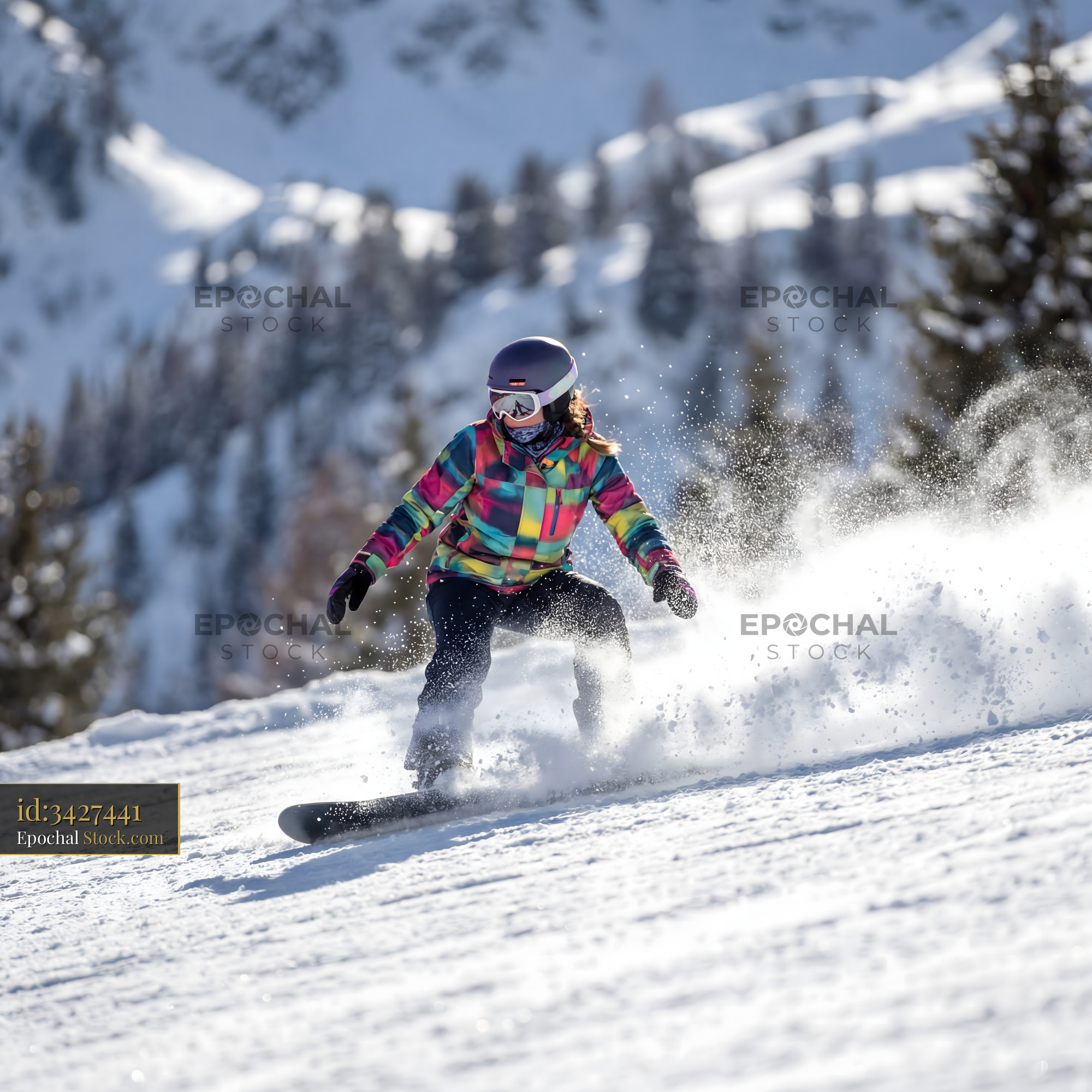 A person is snowboarding down a snowy slope in a mountain area. Trees are visible in the background. The sun shines brightly in the clear sky as the snowboarder kicks up snow.