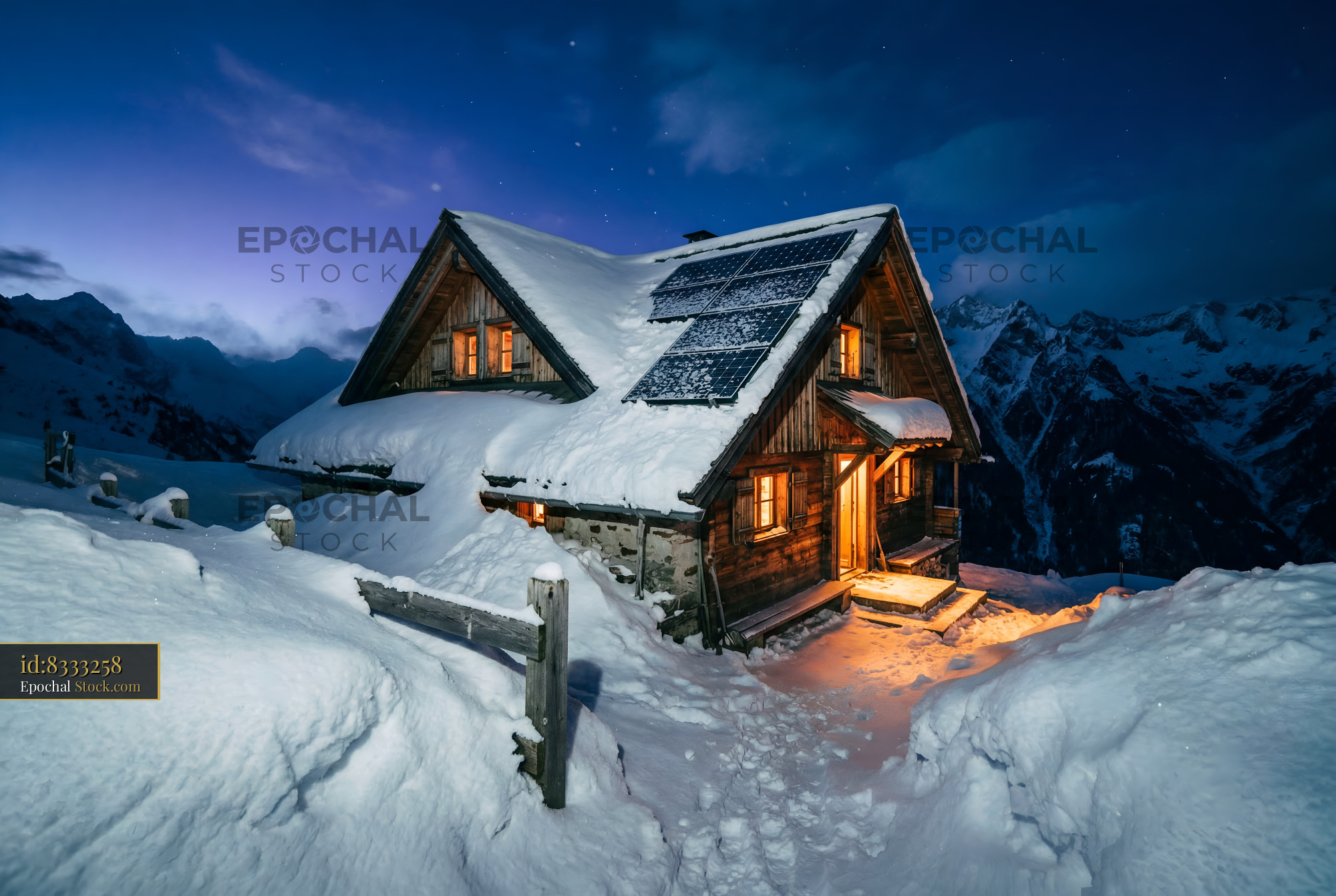 Snowy mountain cabin at night with lights glowing Premium Stock Image
