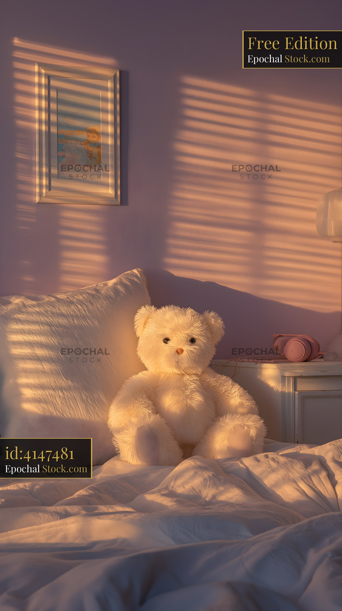 A teddy bear is placed on a bed. The sun shines through the window and creates shadows on the wall. A picture and a small item are nearby. It is afternoon and the light is warm.