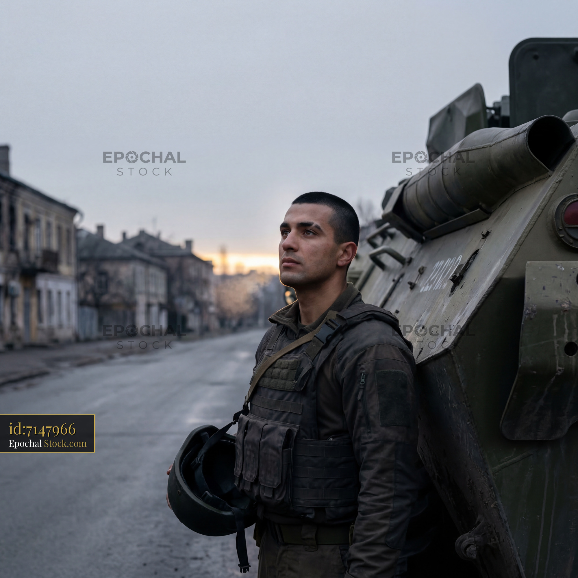 Soldier stands next to military vehicle in quiet street at dusk Premium Stock Image