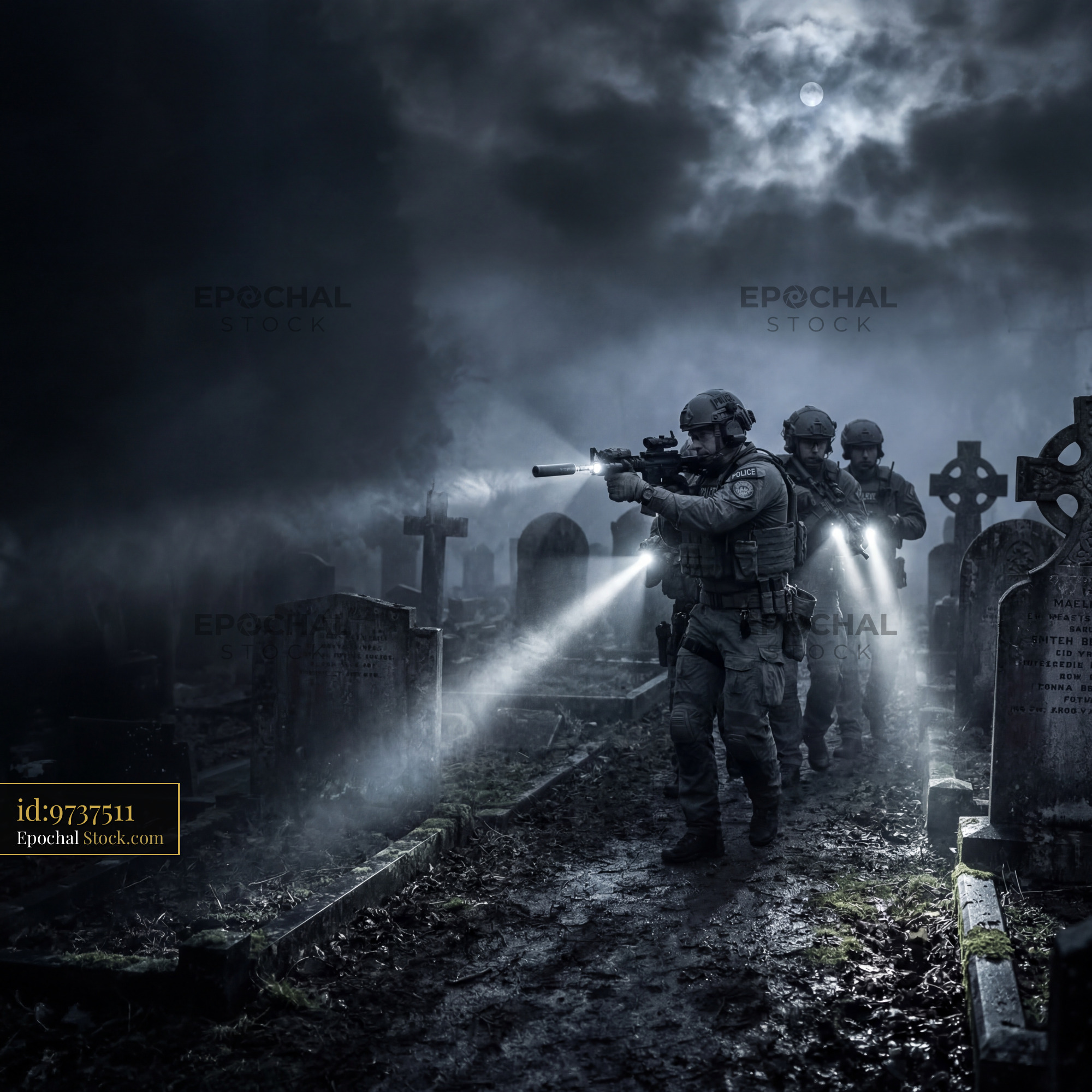 Soldiers walk through graveyard at night with flashlights Premium Stock Photo