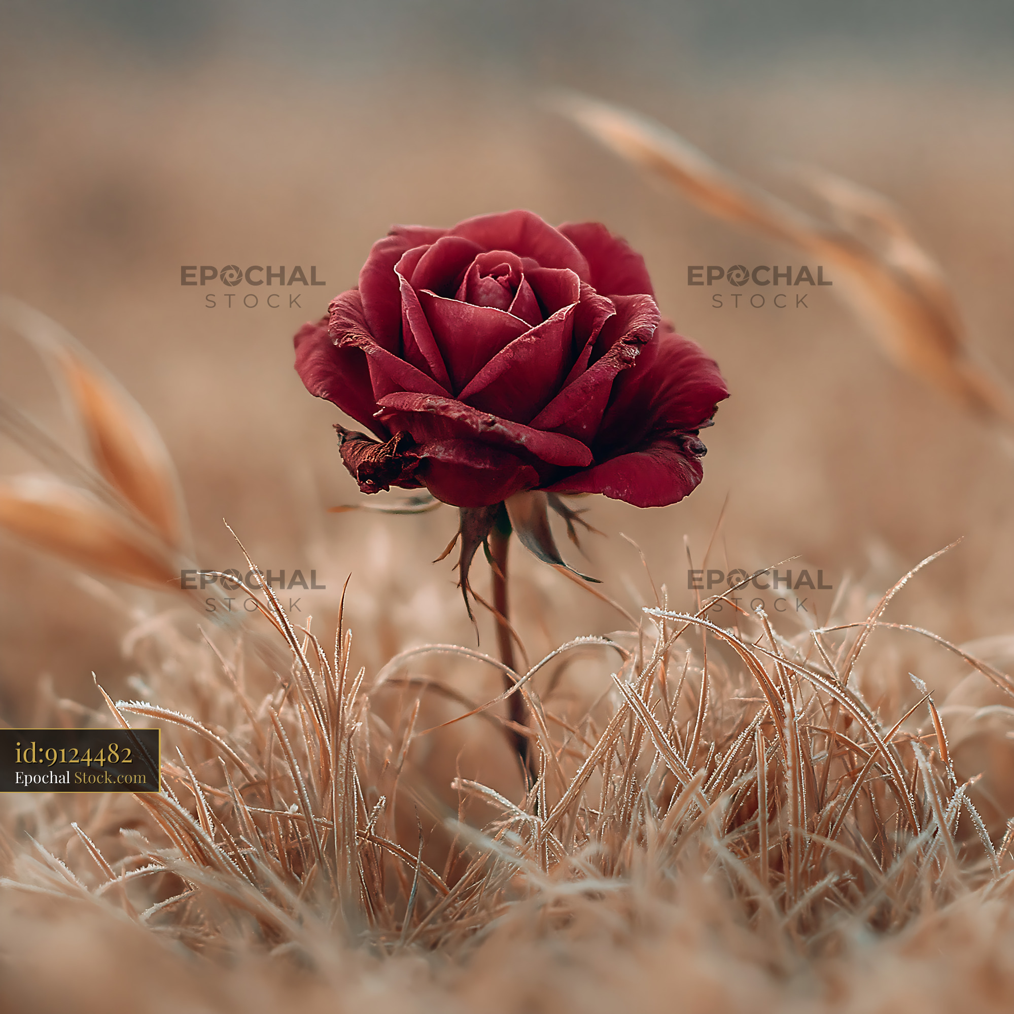 A deep red rose blooms amidst frost-covered dry grass, capturing the melancholy of the last rose of summer and the transition into winter.