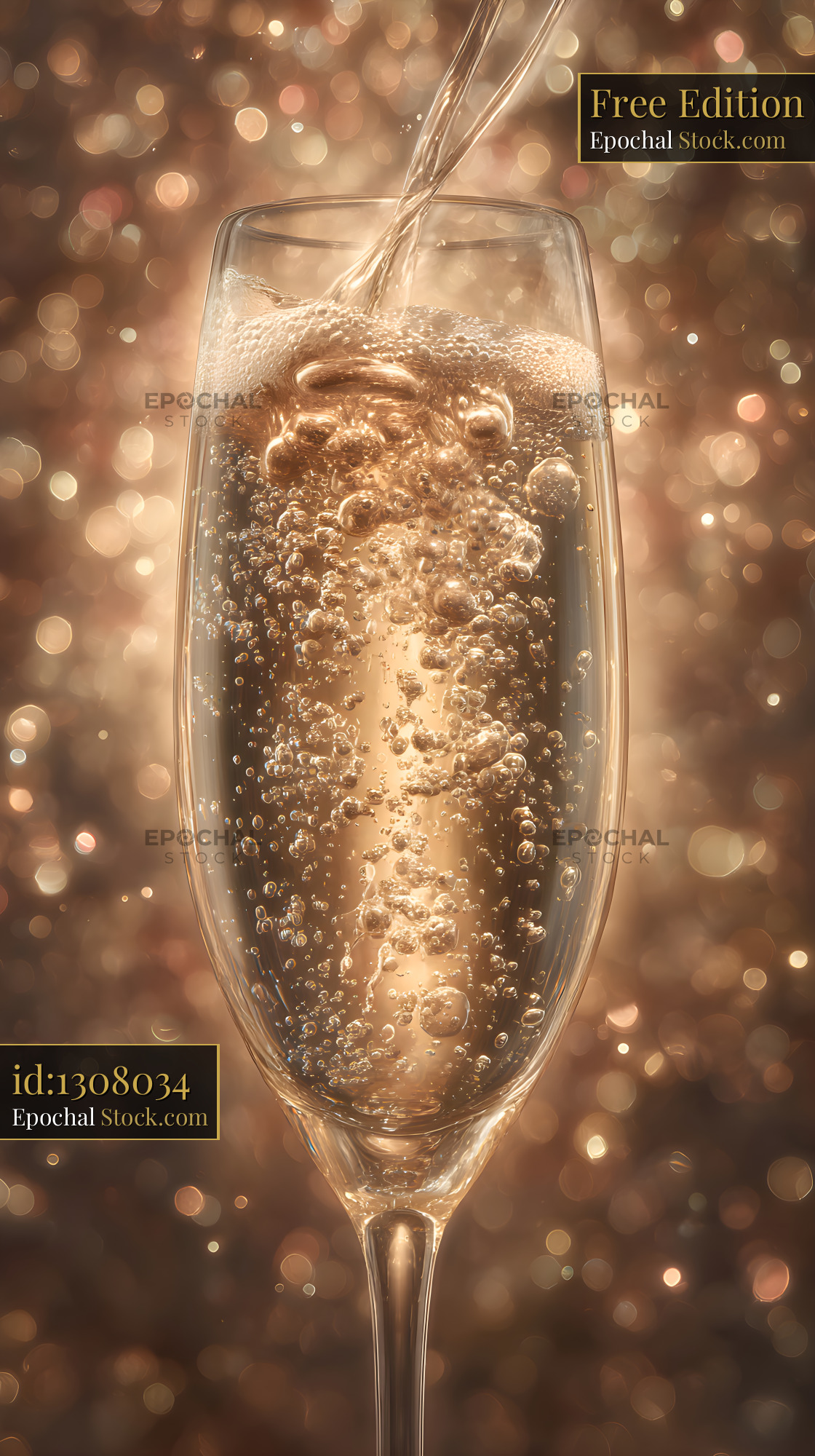A clear glass sits on a table as a sparkling drink pours into it. Bubbles rise quickly to the surface, creating a lively scene. The background has soft, warm lights.