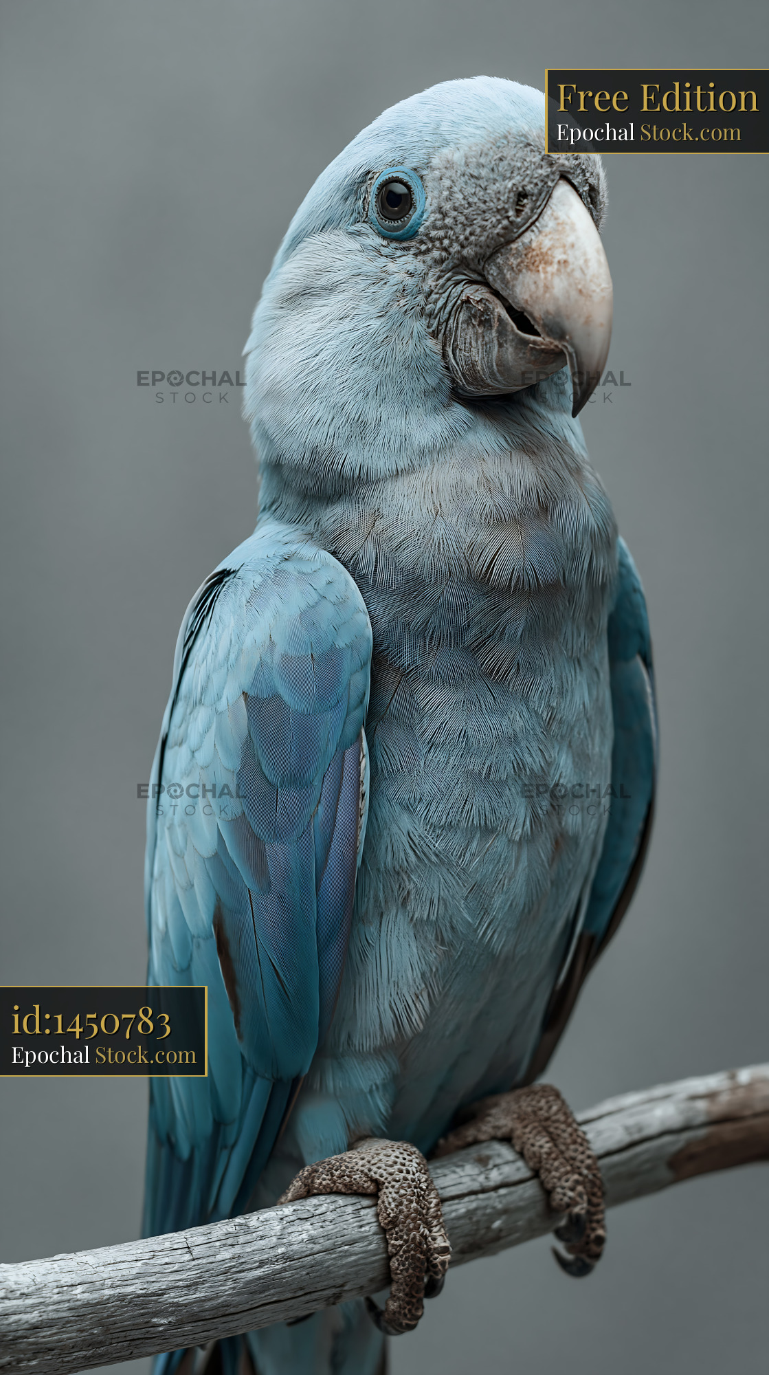 A portrait of a rare blue Spix macaw perched on a weathered wooden branch, capturing its unique plumage and expressive gaze in a calm, minimalist composition.