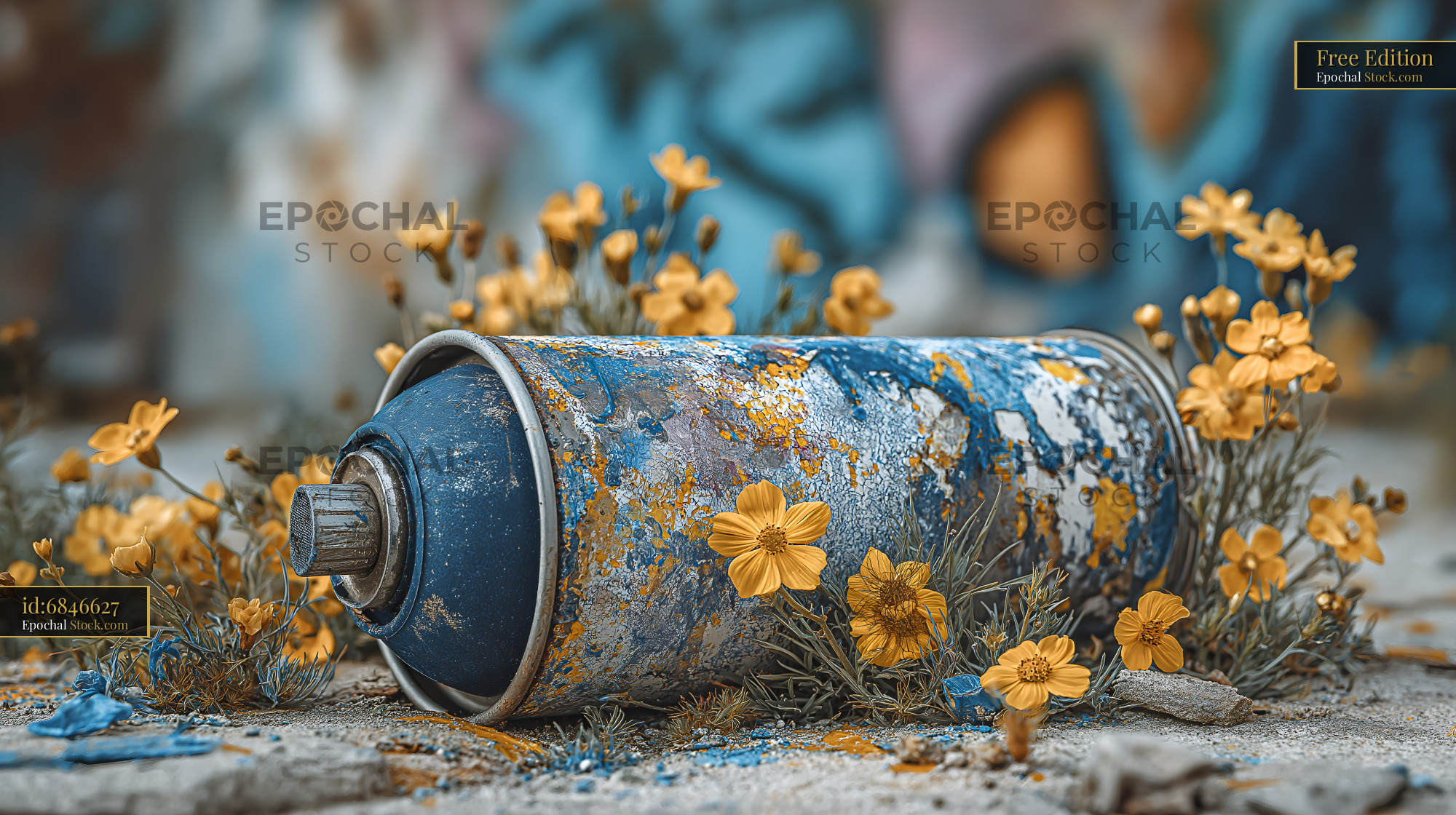 A spray can rests on the ground surrounded by yellow flowers. Colorful graffiti is visible in the background. This scene shows urban art blending with nature in a city area.