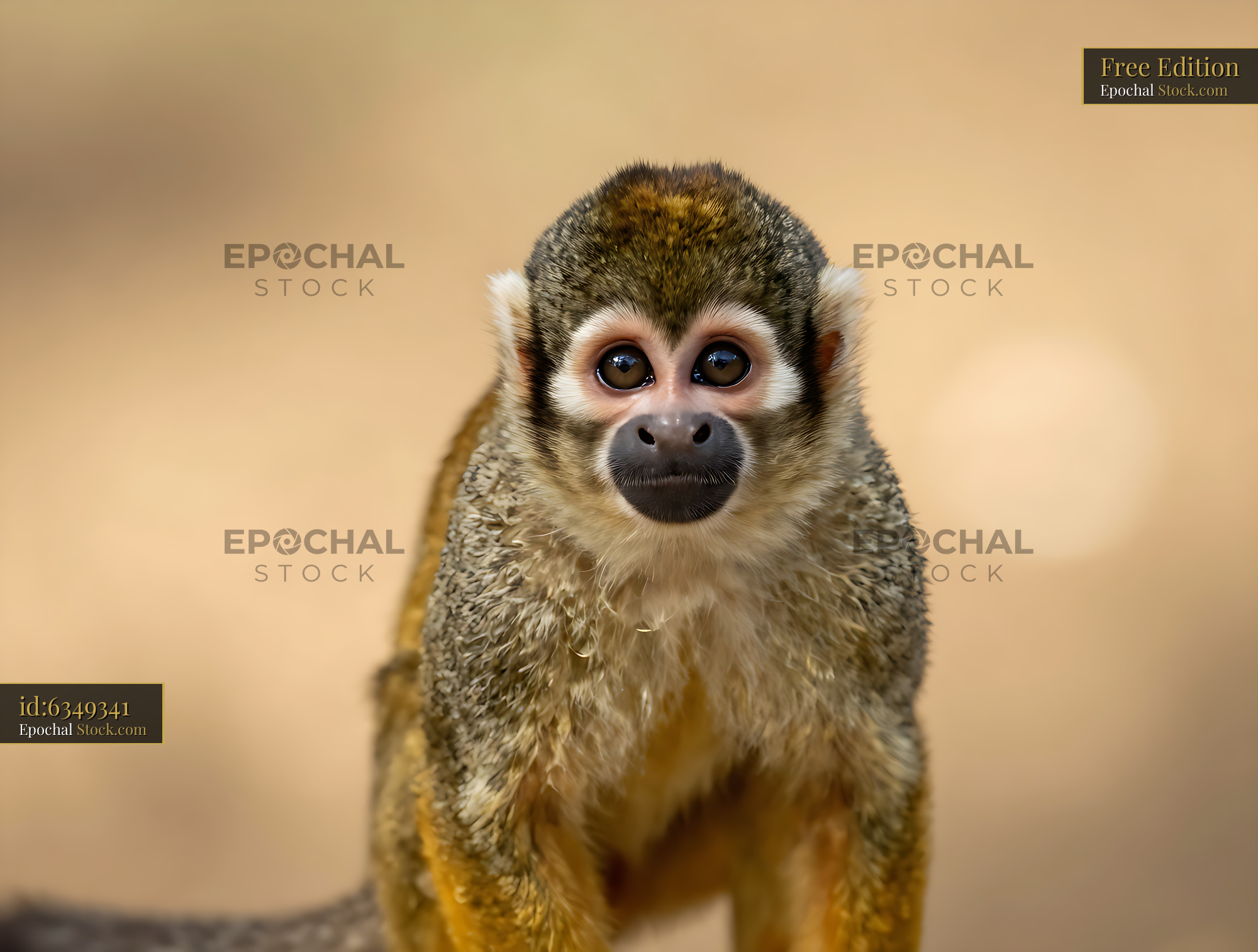 A close-up portrait of a common squirrel monkey against a soft blurred background, capturing its alert and curious nature in a natural setting.