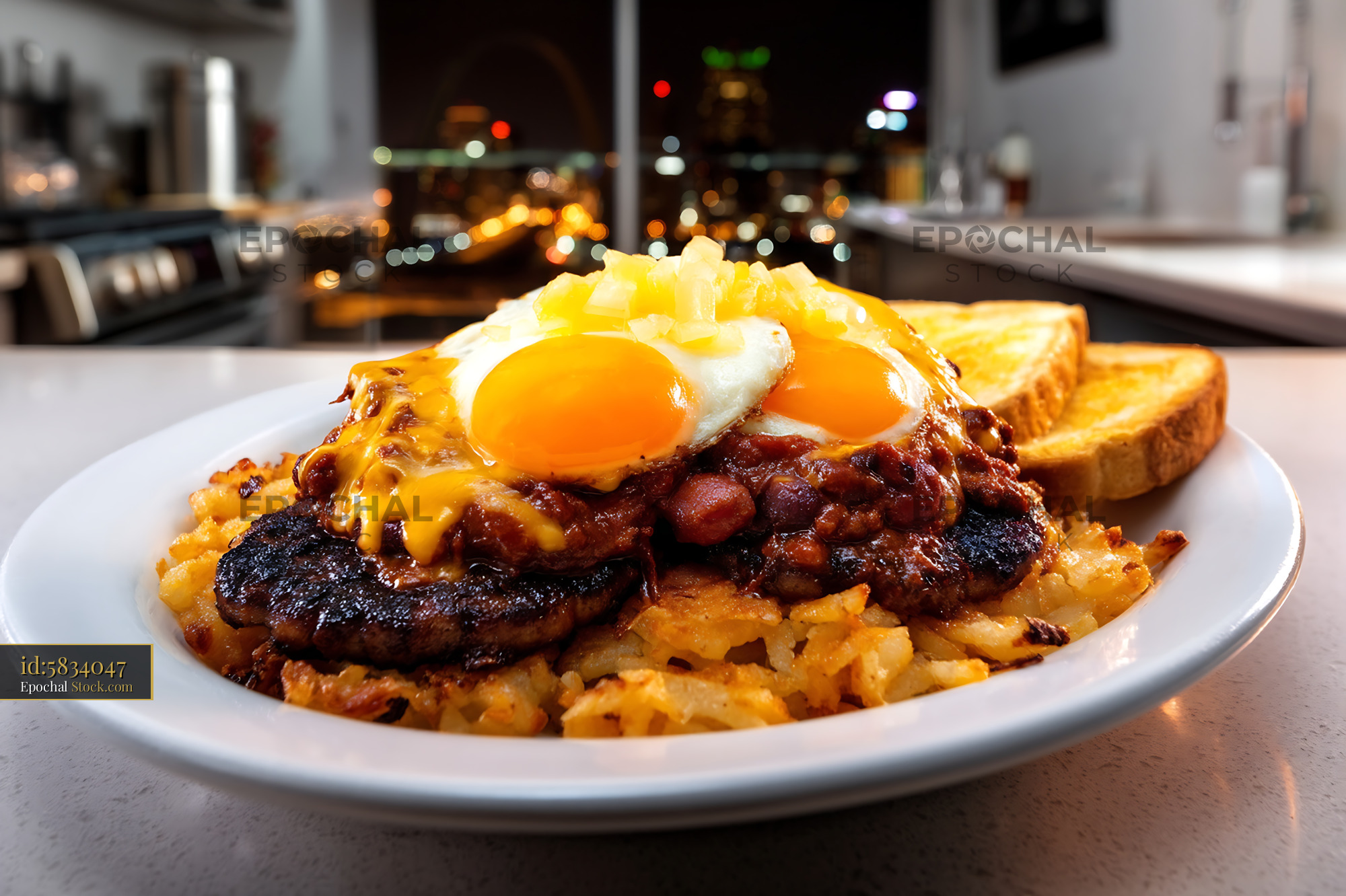 A gourmet St. Louis Slinger is elegantly plated on a white dish, featuring stacked beef patties topped with melted cheddar cheese, two sunny-side-up fried eggs, and crispy hash browns, accompanied by toasted bread. The image captures this iconic St. Louis sandwich in a modern restaurant setting with warm city lights softly blurred in the background, emphasizing the rich, savory colors and appetizing textures of the layered ingredients. This photograph conveys indulgence, comfort, and culinary satisfaction, evoking the beloved street-food tradition reimagined as fine dining. Perfect for restaurant menu design, food blog features, St. Louis tourism campaigns, diner marketing materials, culinary publications, and food photography portfolios showcasing regional American cuisine.