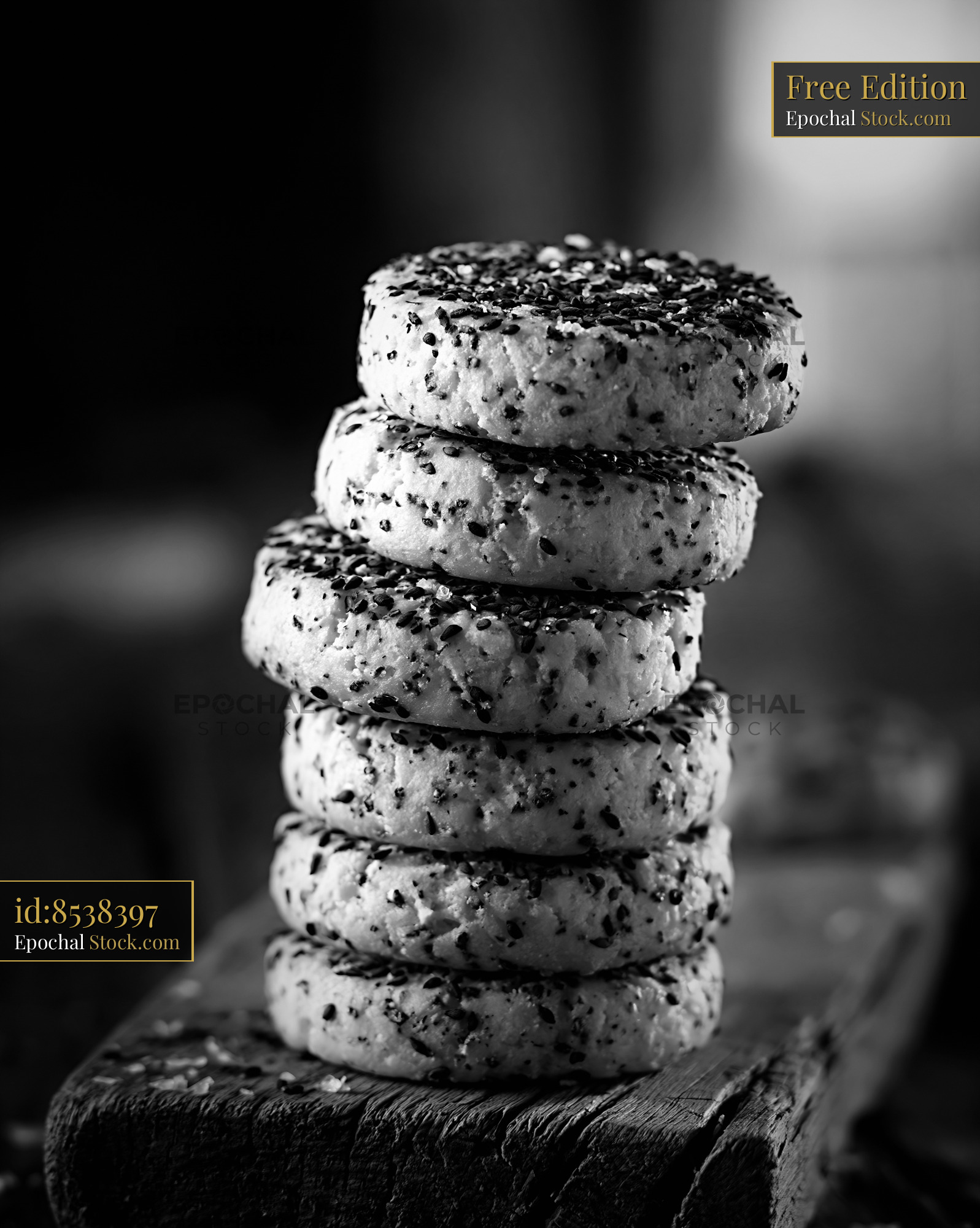 A tall stack of savory nigella seed biscuits on a weathered wooden surface, captured in dramatic black and white to emphasize the artisanal texture and gourmet appeal of these healthy snacks.