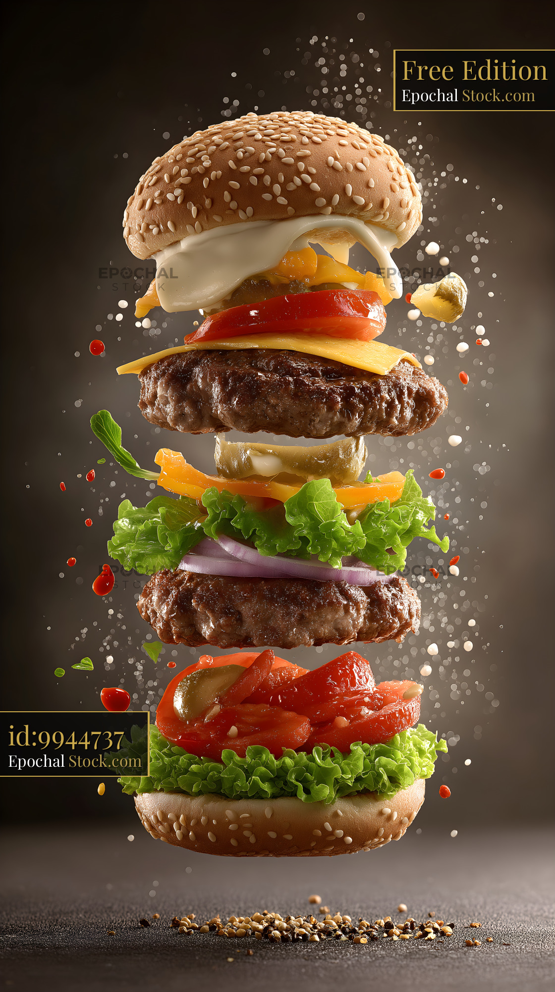 A burger is shown with layers of meat, cheese, vegetables, and sauces. Each component is suspended in the air, highlighting the different ingredients of the burger.
