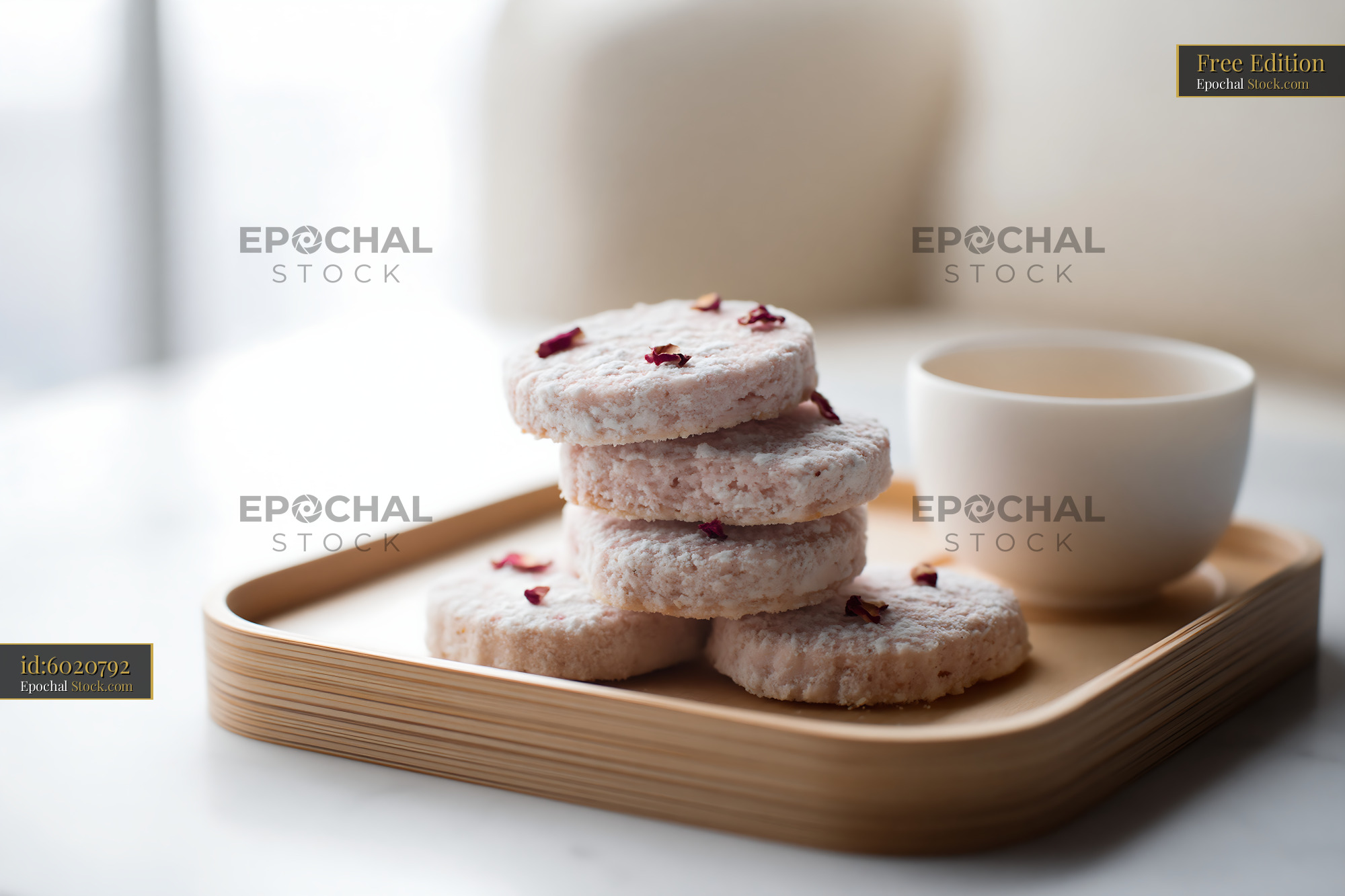 A stack of pink powdered rose water biscuits on a wooden tray evokes a sense of calm, elegance, and a refined floral afternoon tea experience.