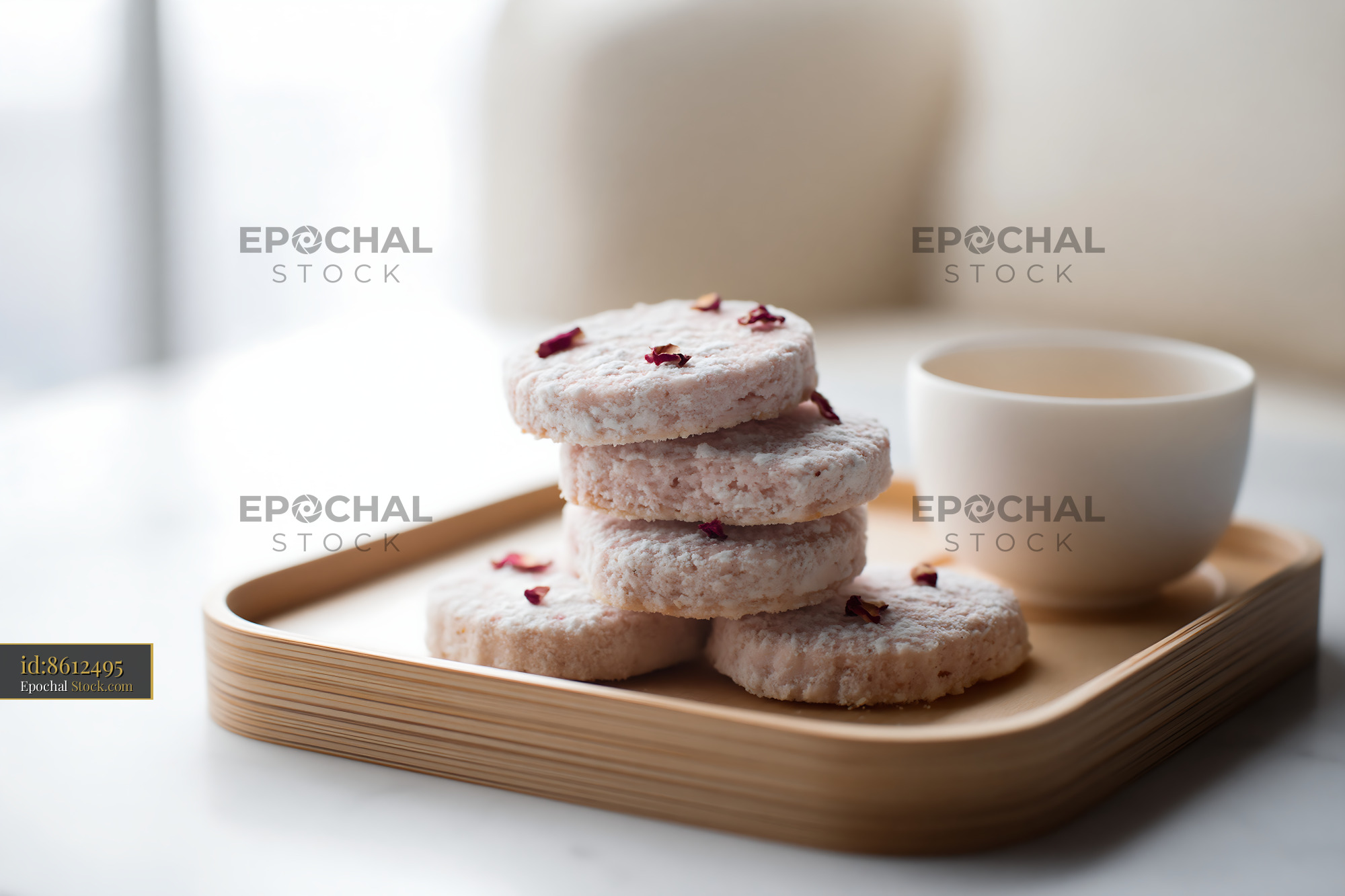 Artisanal rose water cookies dusted with powdered sugar on a minimalist wooden tray, evoking themes of elegance, floral flavors, and a calm afternoon tea break.