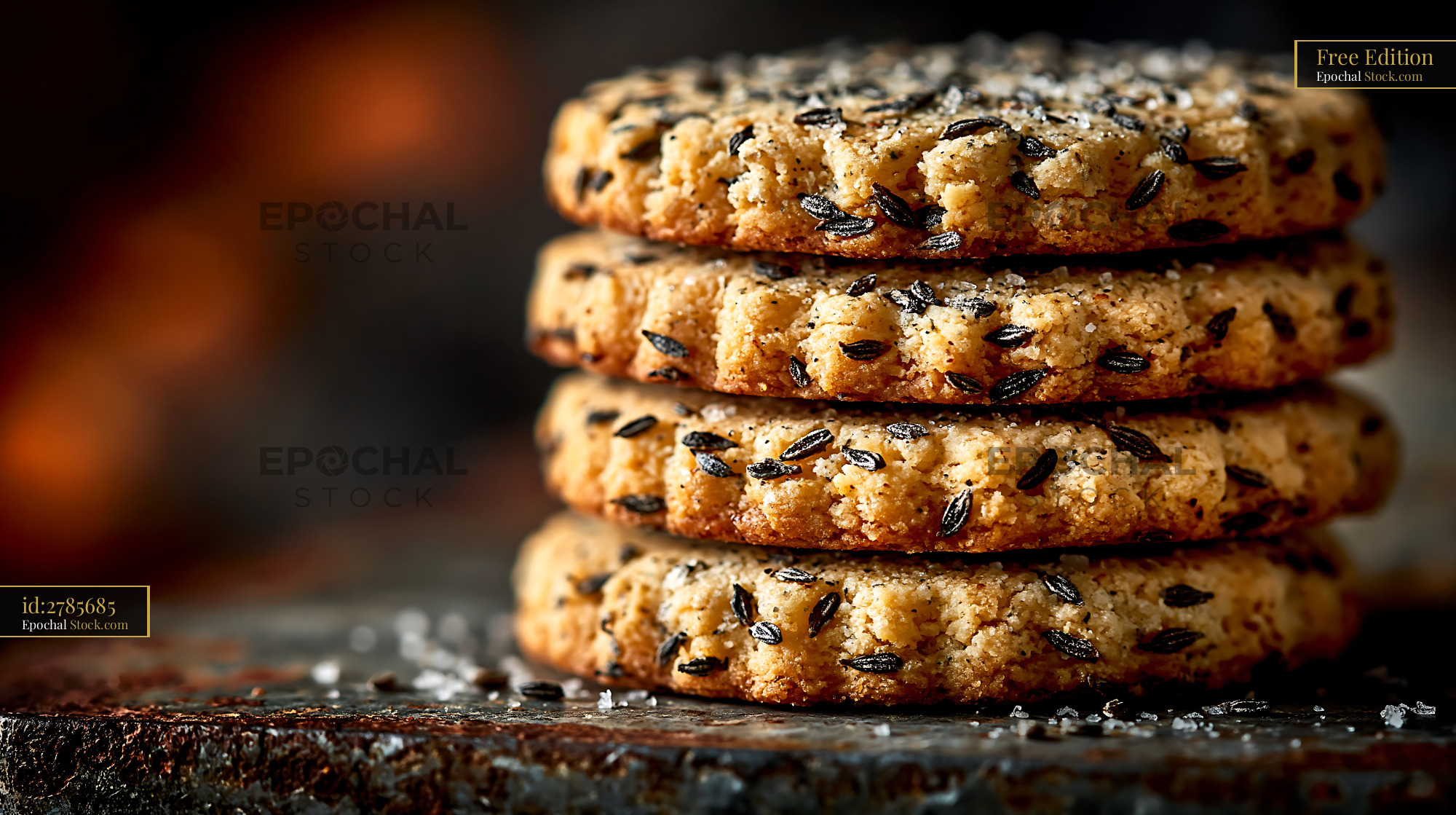 A stack of freshly baked savory caraway seed biscuits topped with sea salt, evoking a warm, rustic atmosphere of traditional artisanal baking and cozy kitchen moments.