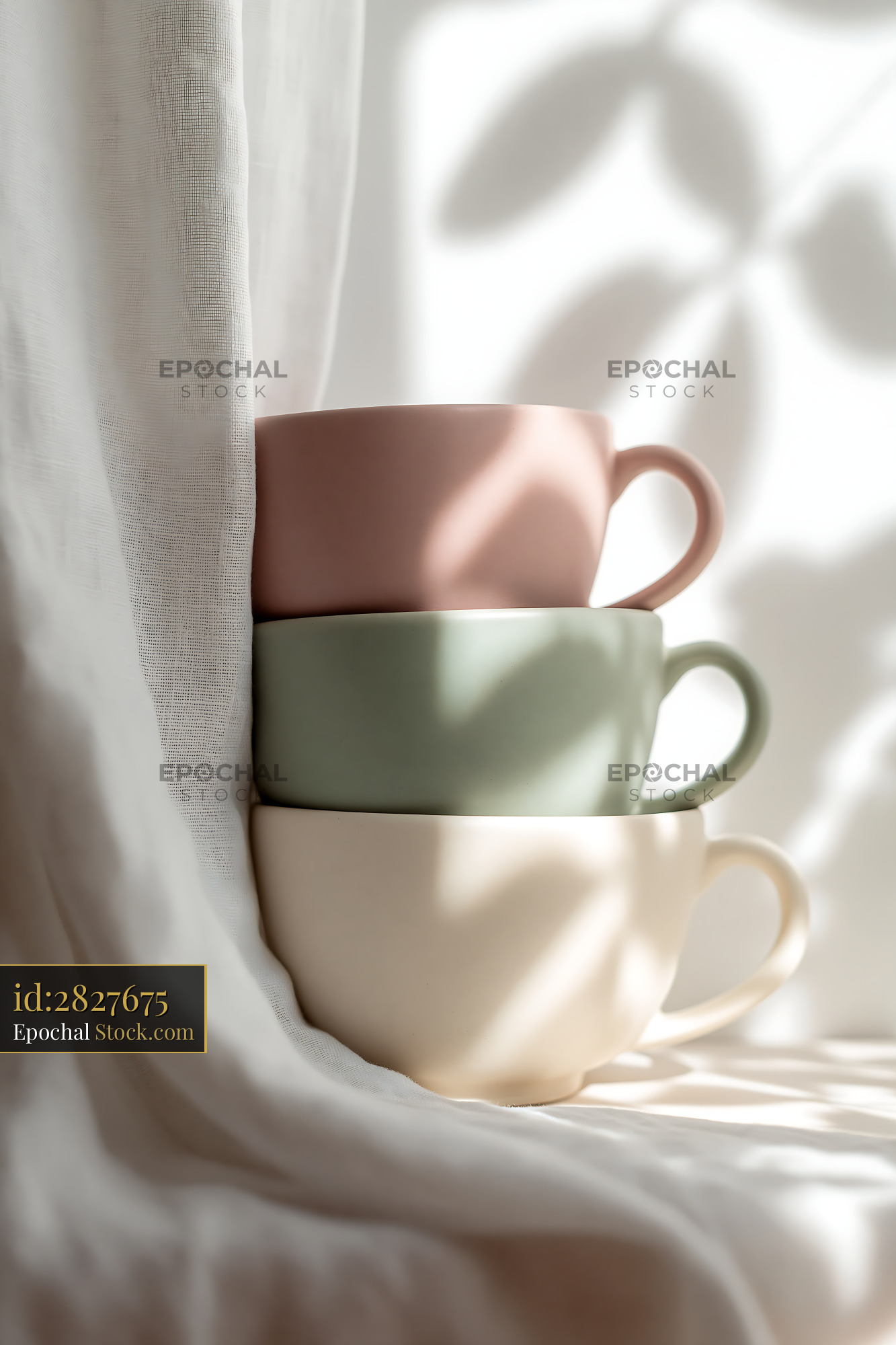 A stack of three ceramic mugs in soft pastel tones rests by a window, bathed in gentle morning sunlight and delicate leaf shadows, reflecting a peaceful moment of slow living and mindfulness.