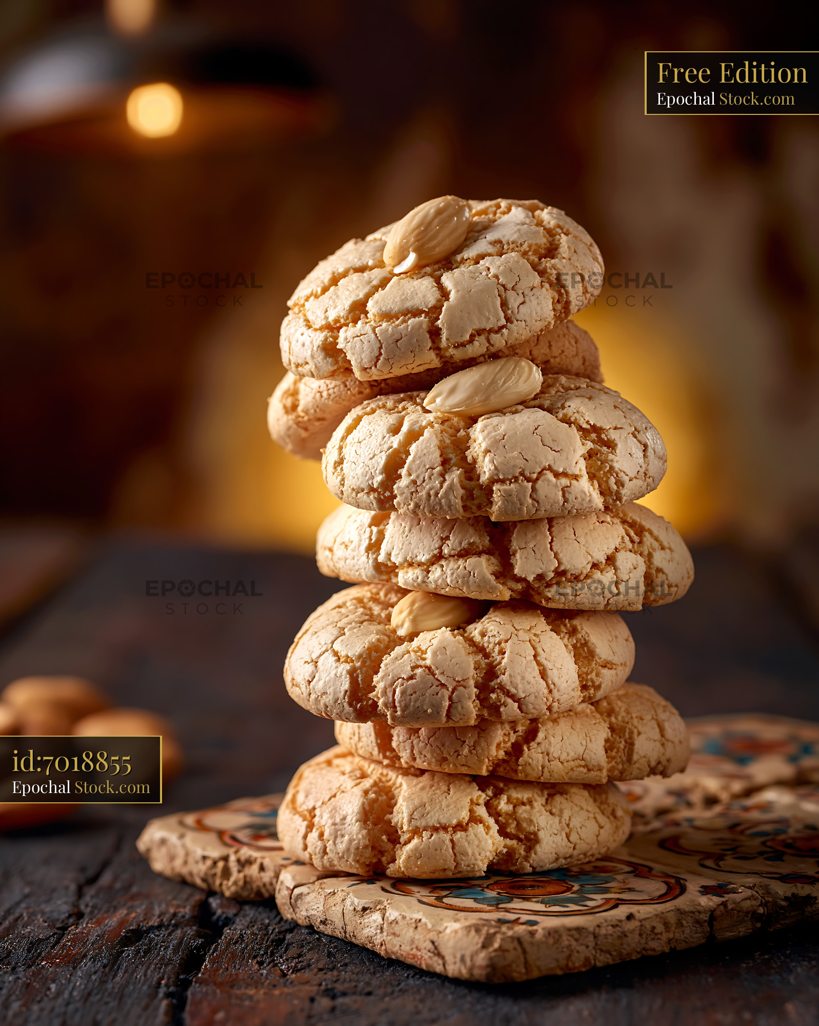 A tall stack of handmade Turkish almond cookies on a decorative stone tile, featuring warm moody lighting to evoke a sense of tradition and authentic culinary heritage.