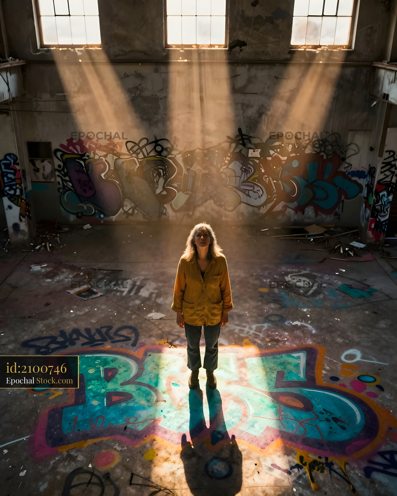 A person stands alone in a large, empty warehouse. Light filters through the windows, casting beams on colorful graffiti that covers the floor and walls.