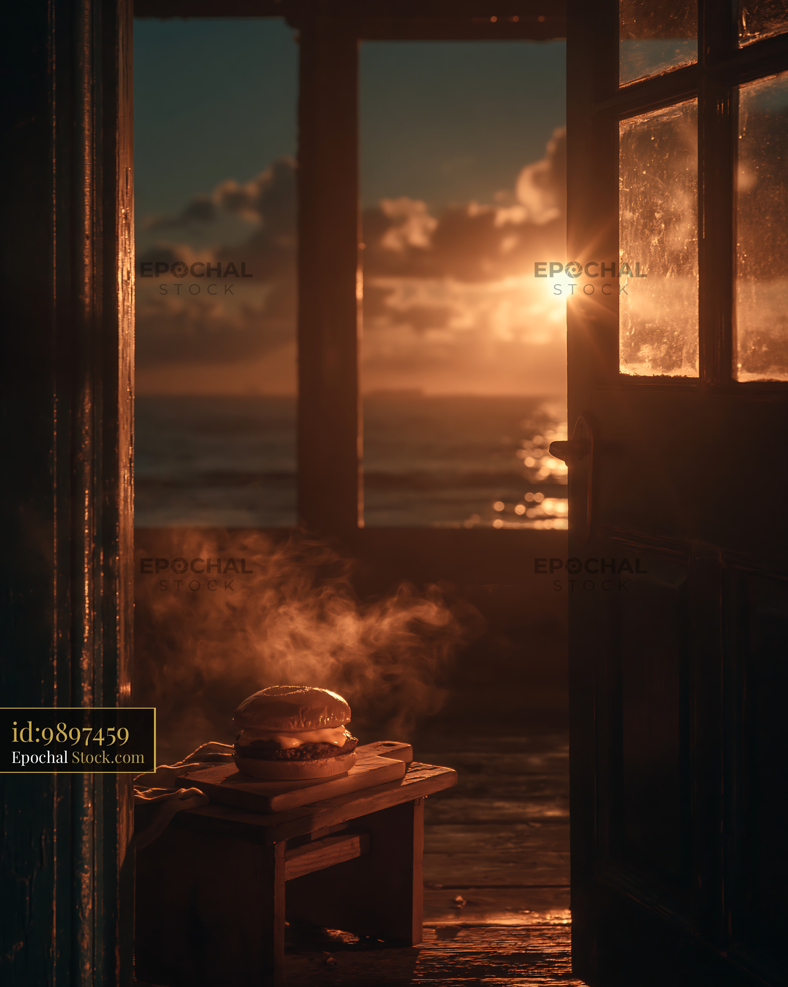 Steaming burger in a rustic beach cabin doorway at sunset