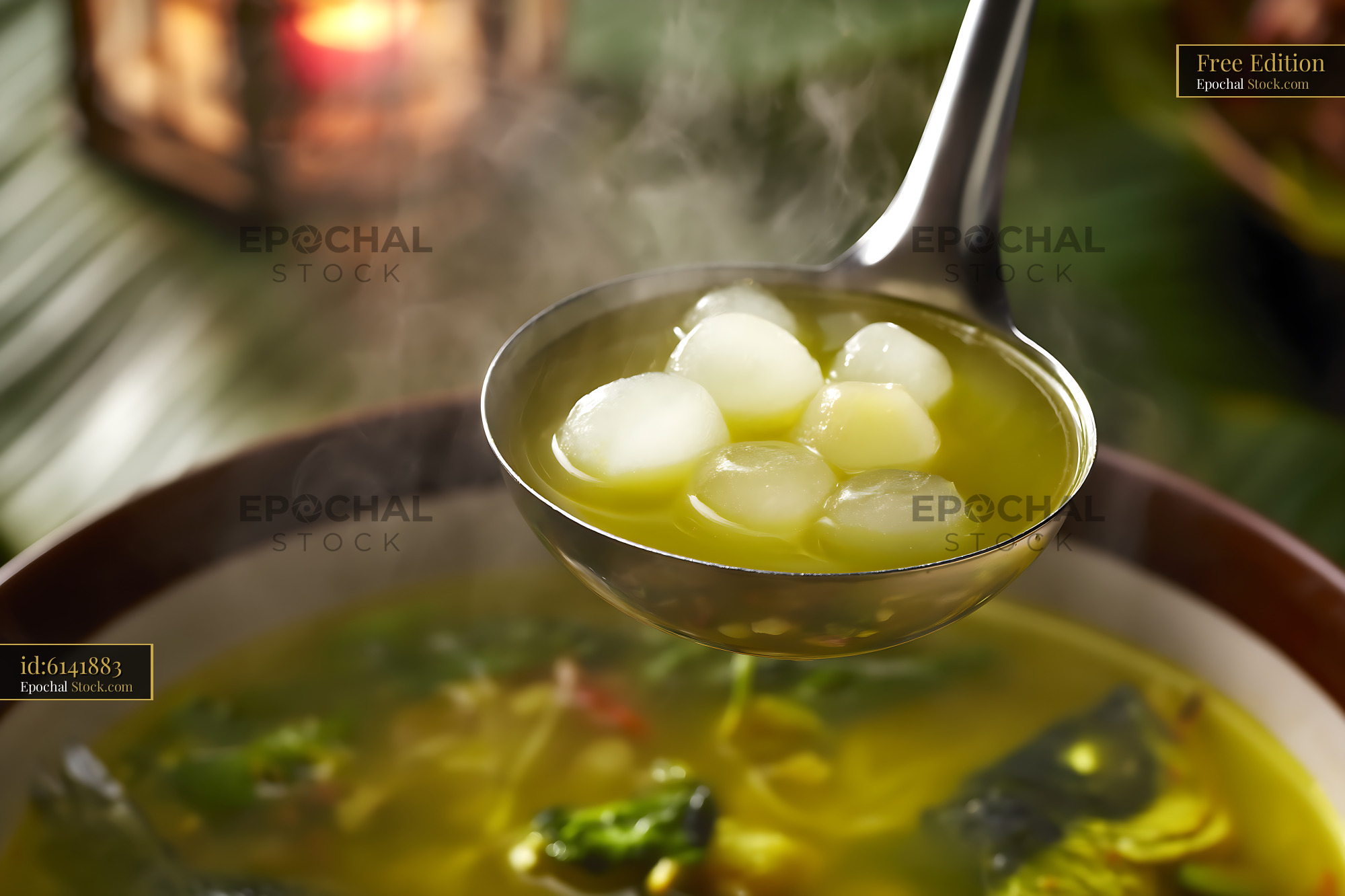 A close-up shot features a steaming ladle holding traditional Lor Mee soup, showcasing several white, round dumplings submerged in the rich, yellowish-green broth, with a larger bowl of soup blurred in the background. The rising steam evokes warmth and comfort, highlighting the freshness and inviting aroma of this classic Asian dish, suggesting a hearty and satisfying meal. Ideal for food blogs, restaurant menus, culinary websites, or travel guides promoting Asian cuisine. Perfect for illustrating authentic cultural food experiences and comfort food themes.