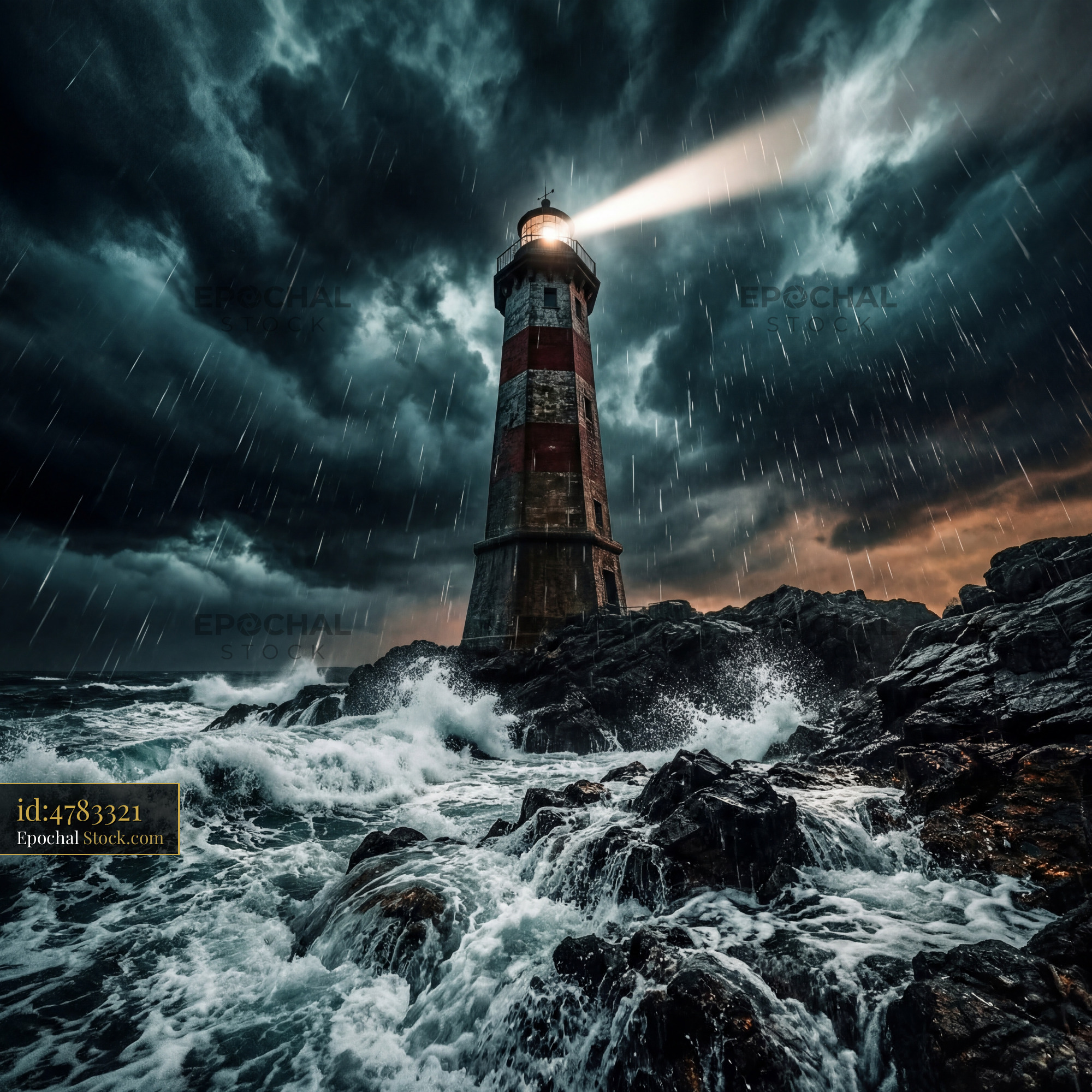 Heavy rain falls on the lighthouse as waves crash against the rocks. Dark clouds fill the sky, adding to the dramatic scene during a stormy evening by the sea.