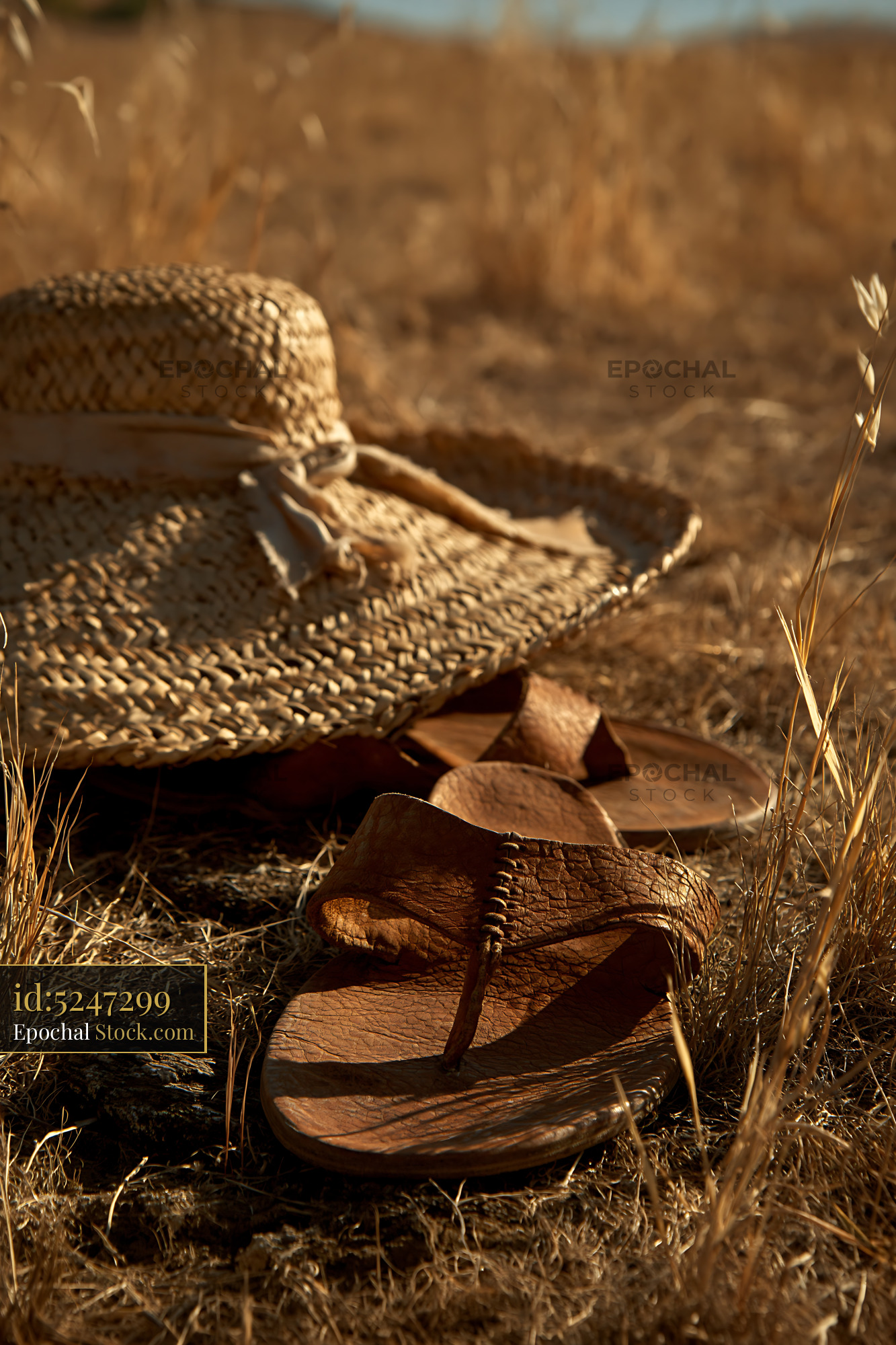 A pair of worn leather sandals and a wide-brimmed straw hat rest on sun-parched grass in a rural field, evoking themes of summer relaxation, nostalgia, and quiet solitude.