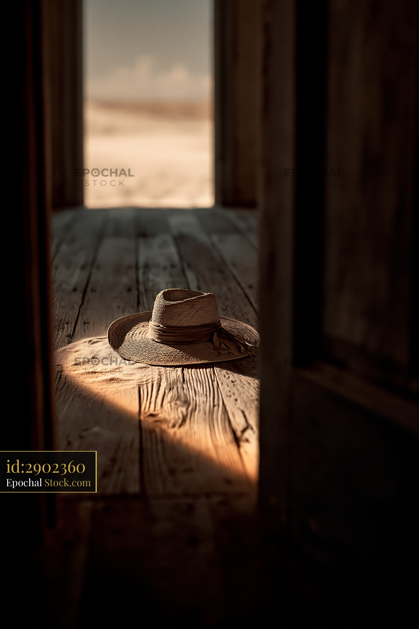 A weathered straw hat lies abandoned on dusty wooden floorboards, framed by a sunlit doorway that opens to a desert landscape, evoking themes of solitude, memory, and the passage of time.