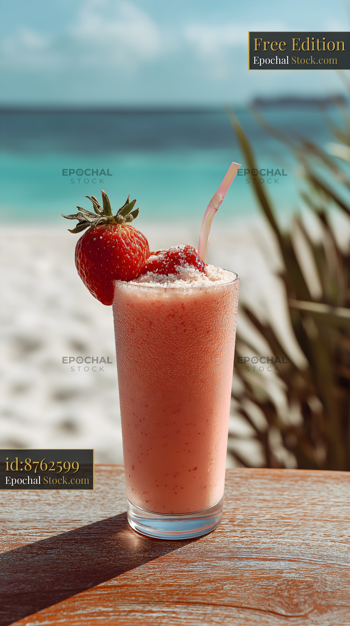 A glass of strawberry drink sits on a wooden table near the beach. The drink has fresh strawberries on top. The ocean water is clear, and the sky is blue.