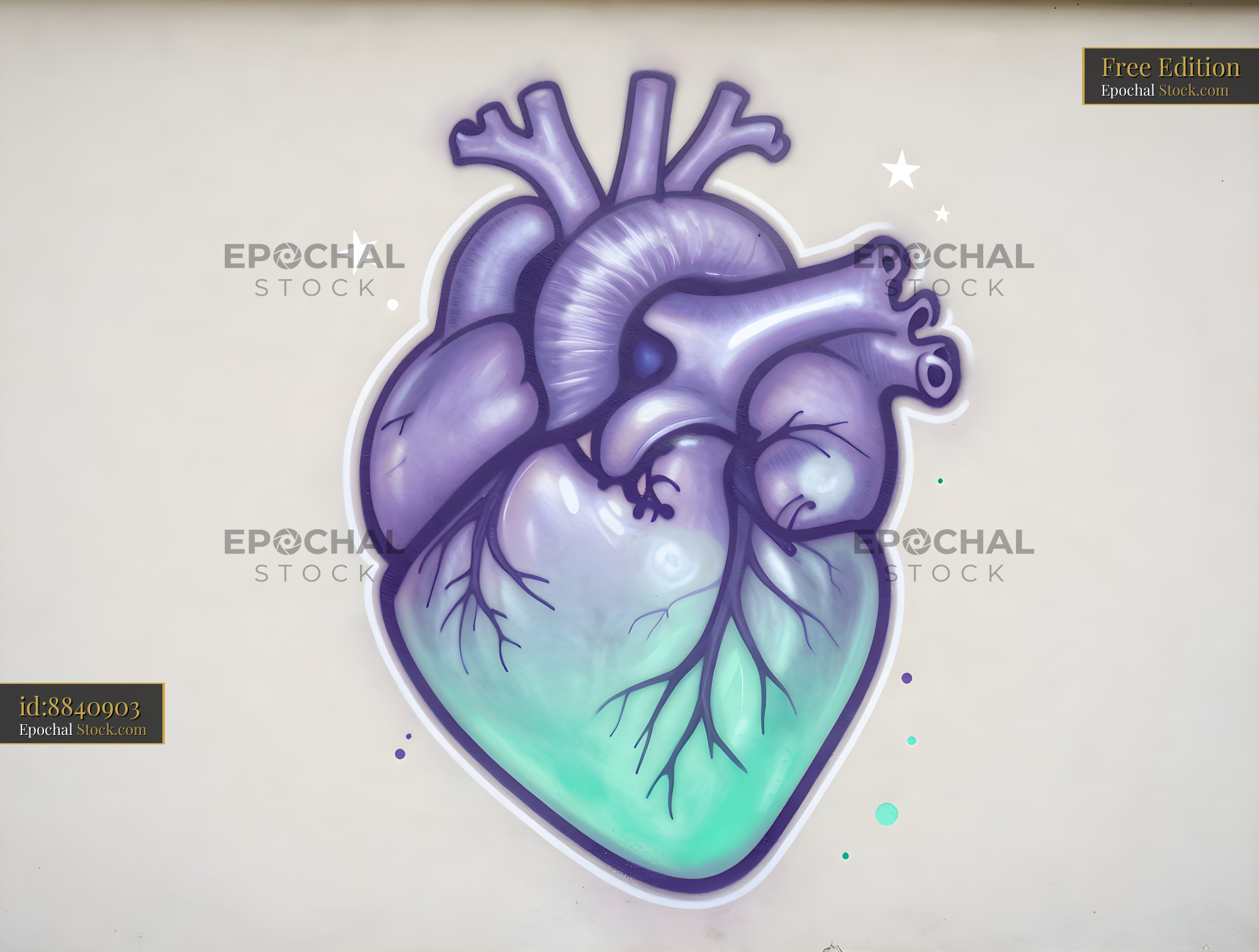 A colorful heart design is painted on a wall in a city. The artwork includes details like veins and chambers. The background is simple, allowing the heart to stand out in the location.