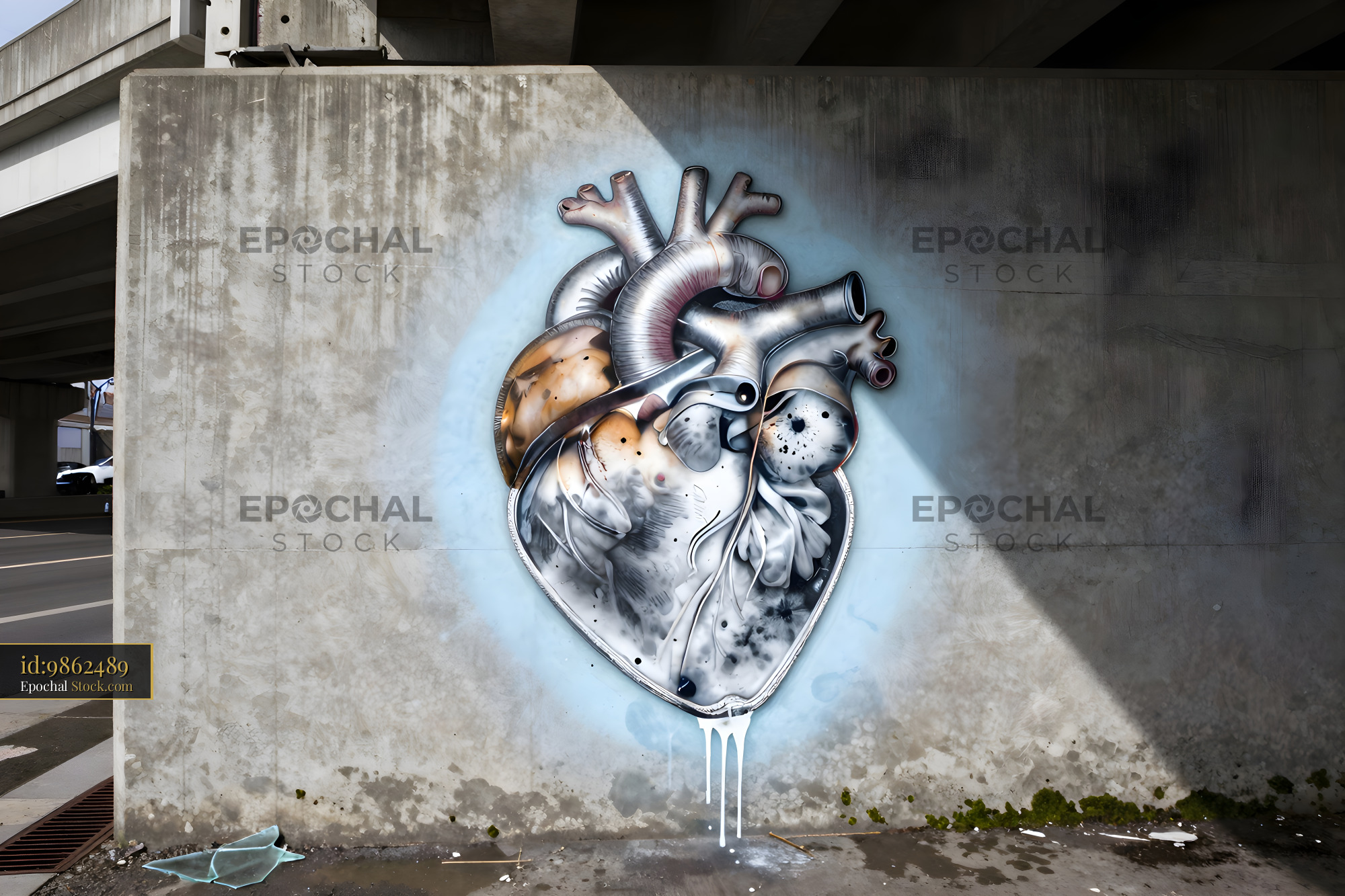 A large heart design is painted on a concrete wall under a bridge. The street art features realistic details. Sunlight shines on part of the wall, highlighting the artwork.