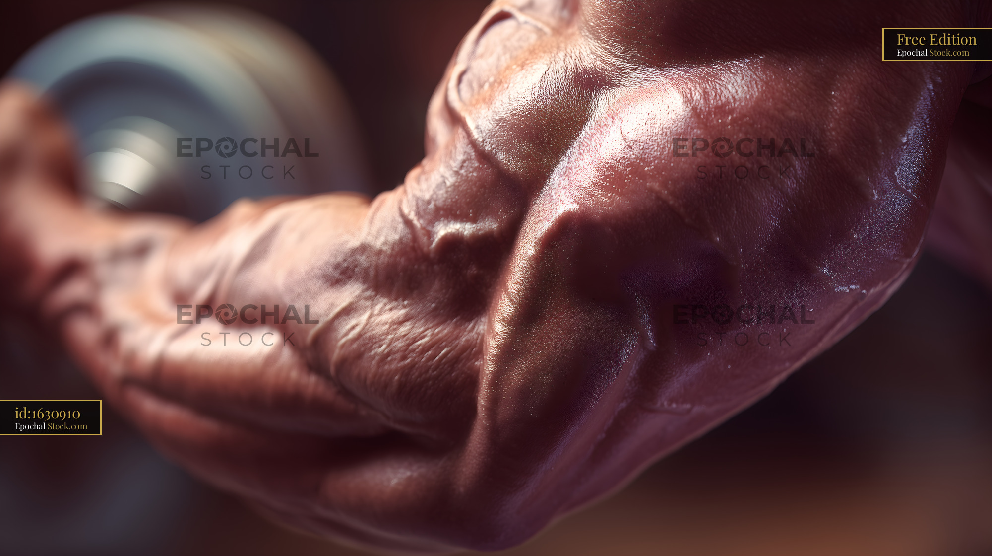 A close view of a muscular arm lifting a dumbbell in a gym. The focus is on the defined muscles and veins of the arm during exercise. The setting shows a workout in progress.