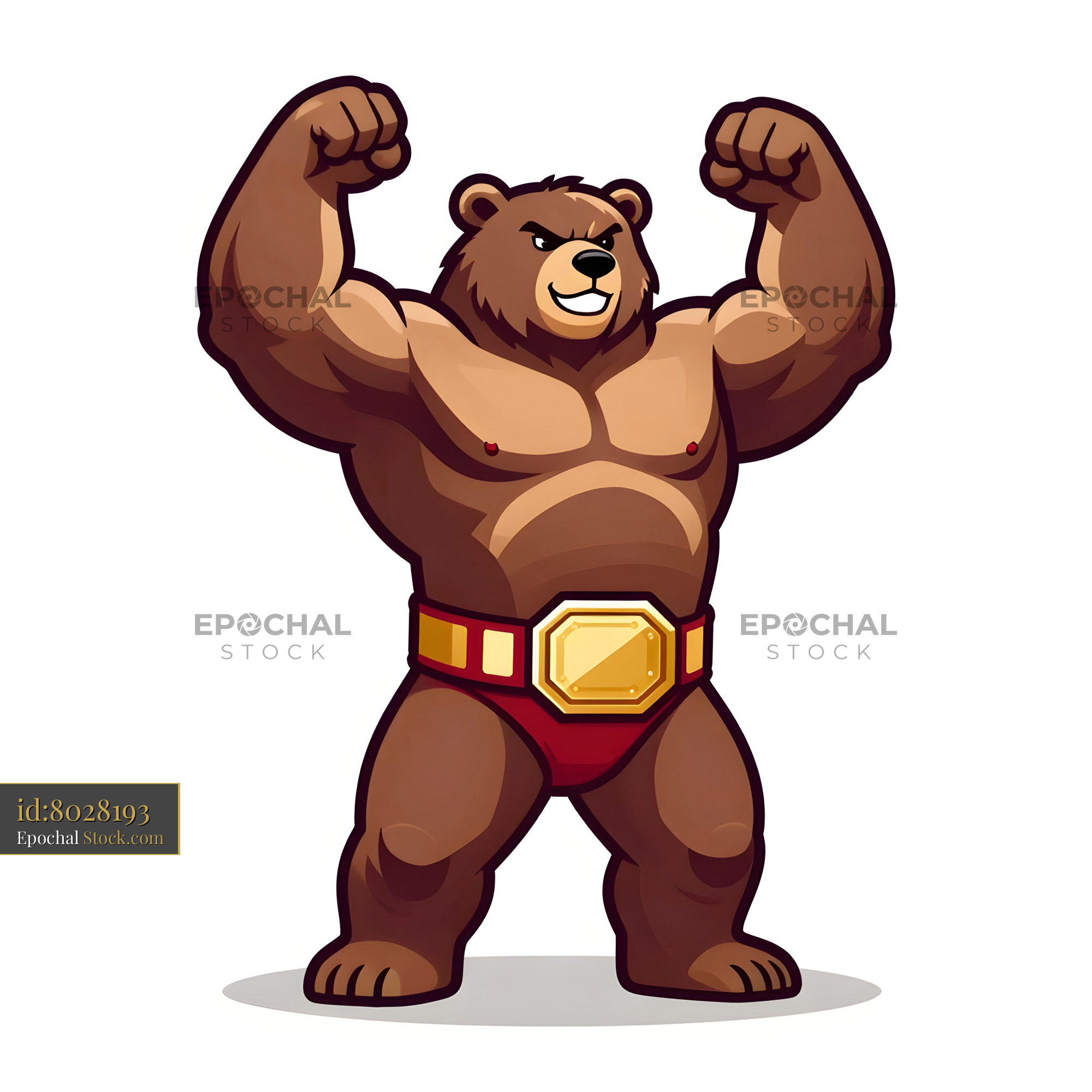 A bear stands tall with lifted arms, showcasing strong muscles. It wears a championship belt and presents a powerful image. The scene has no background or distractions.